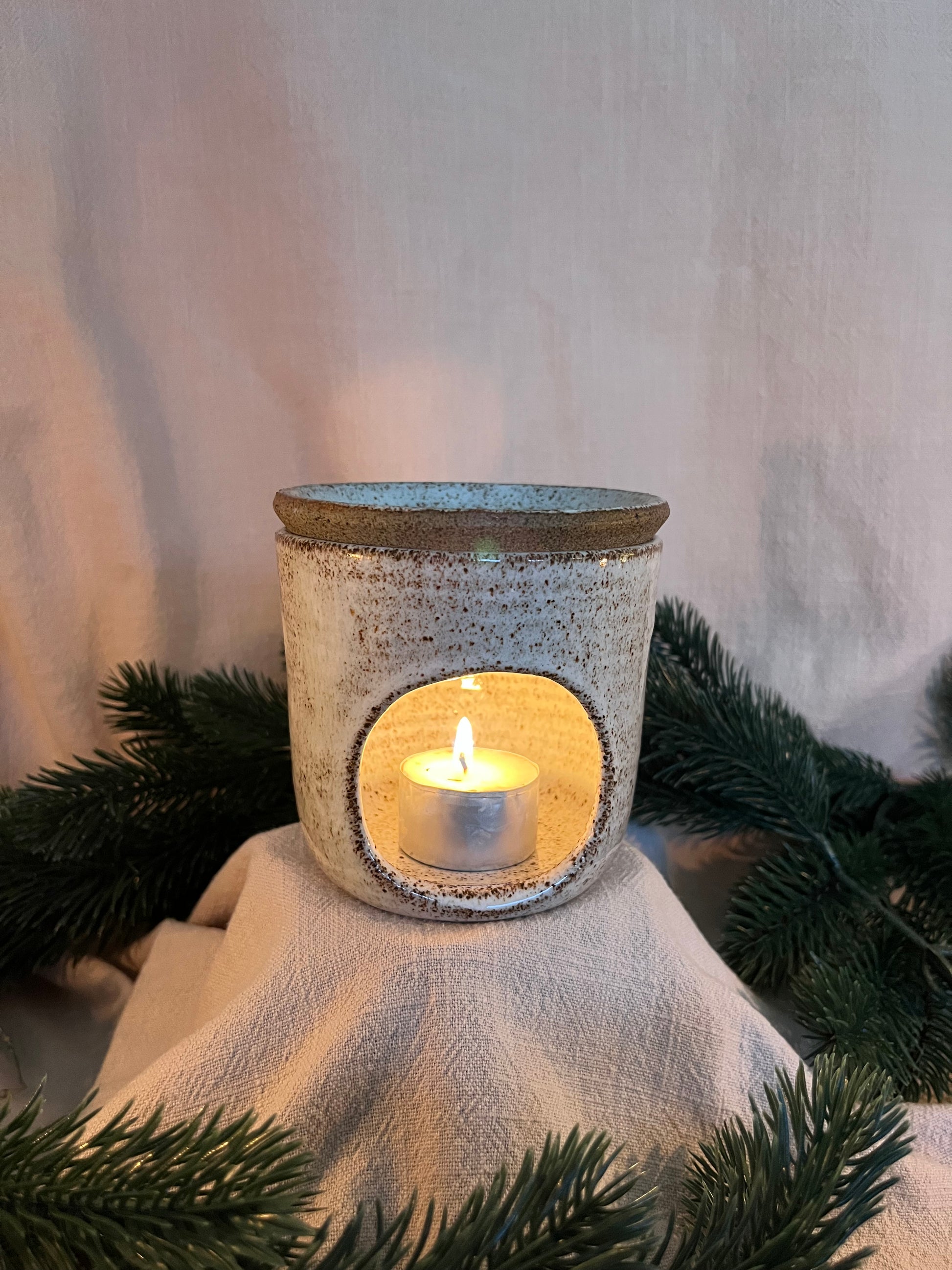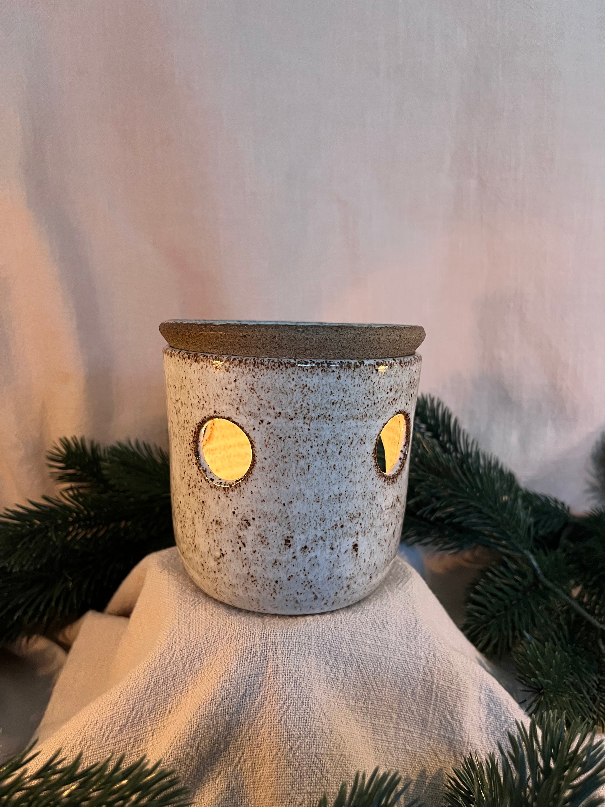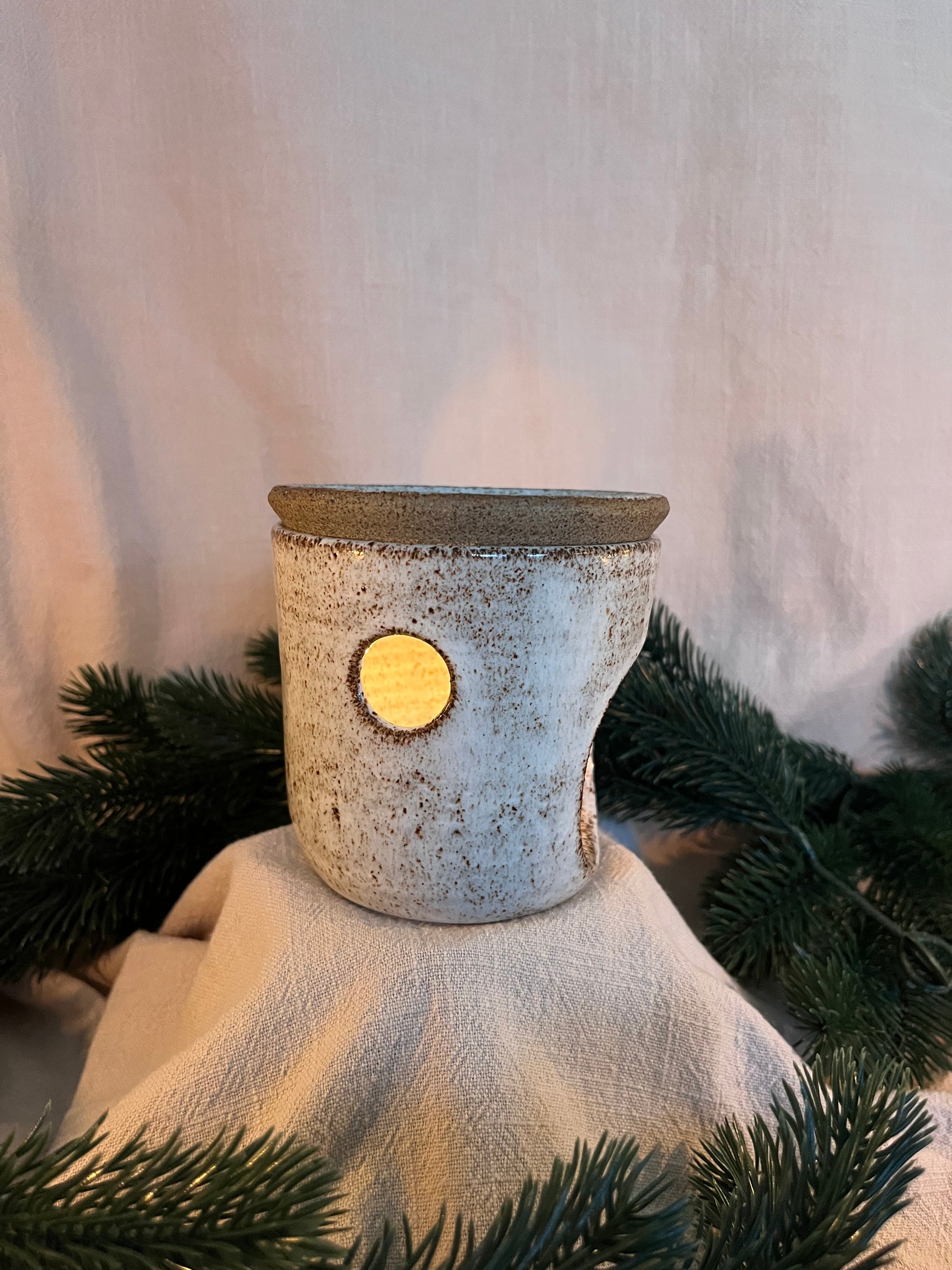 Drejad aromalampa i grov stengodslera. Glaserad i vit blank glasyr.