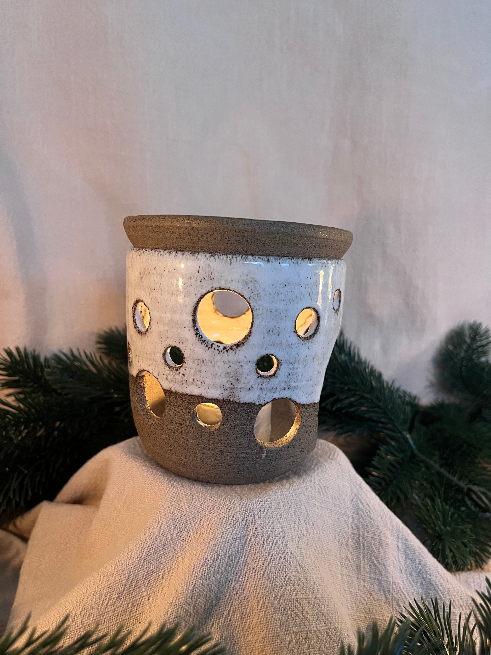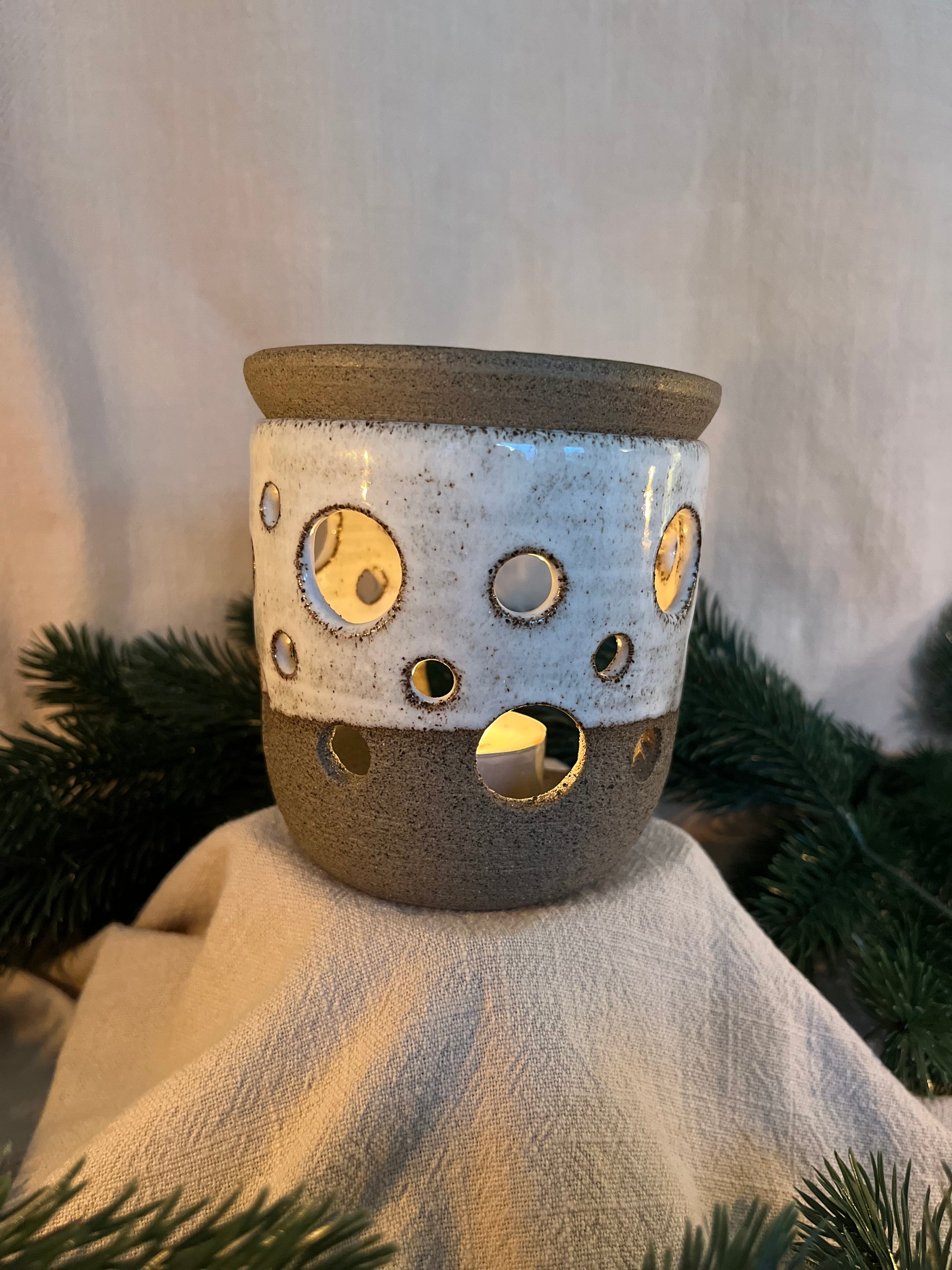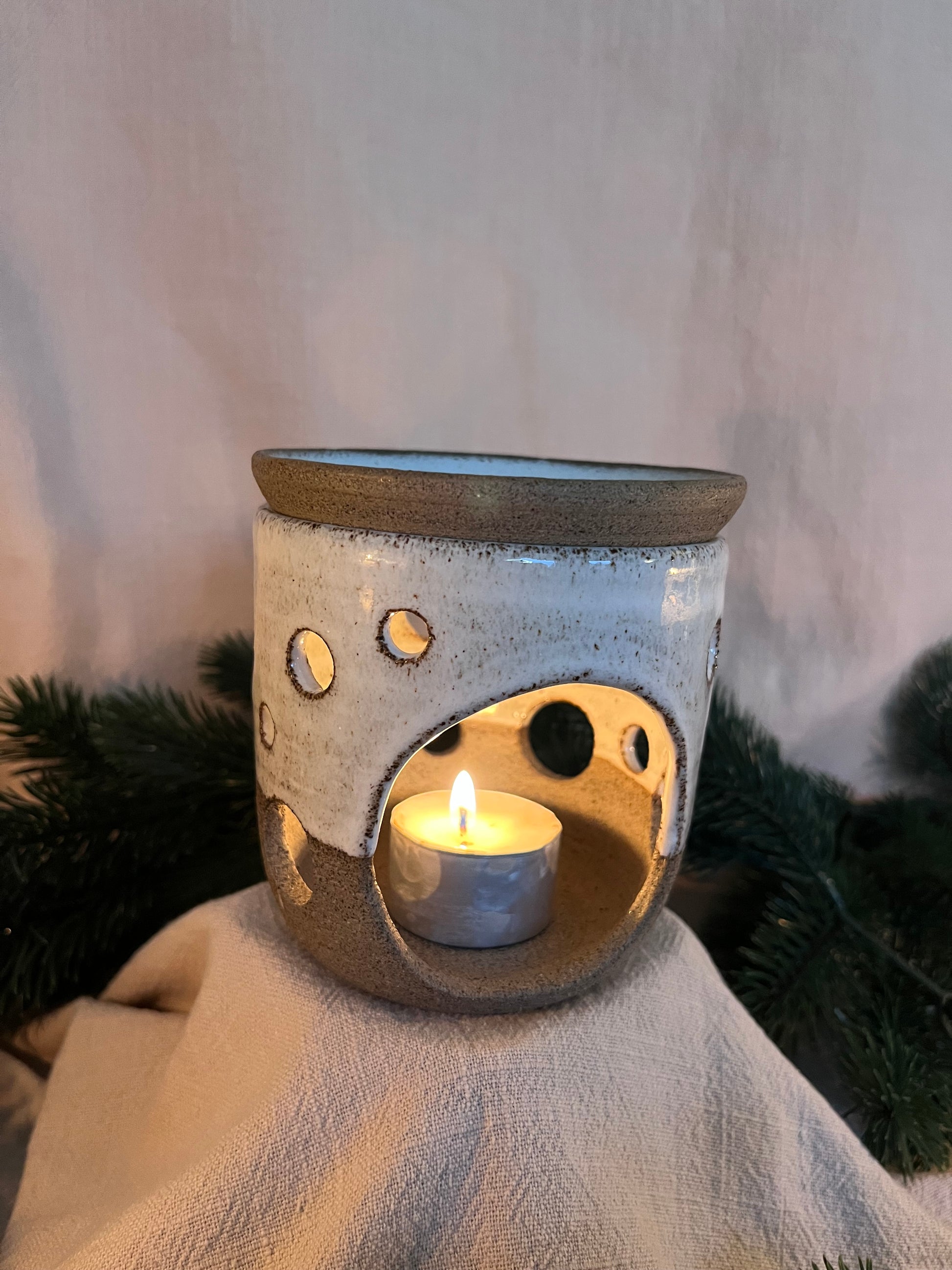 Drejad aromalampa i grov stengodslera. Glaserad i vit blank glasyr.