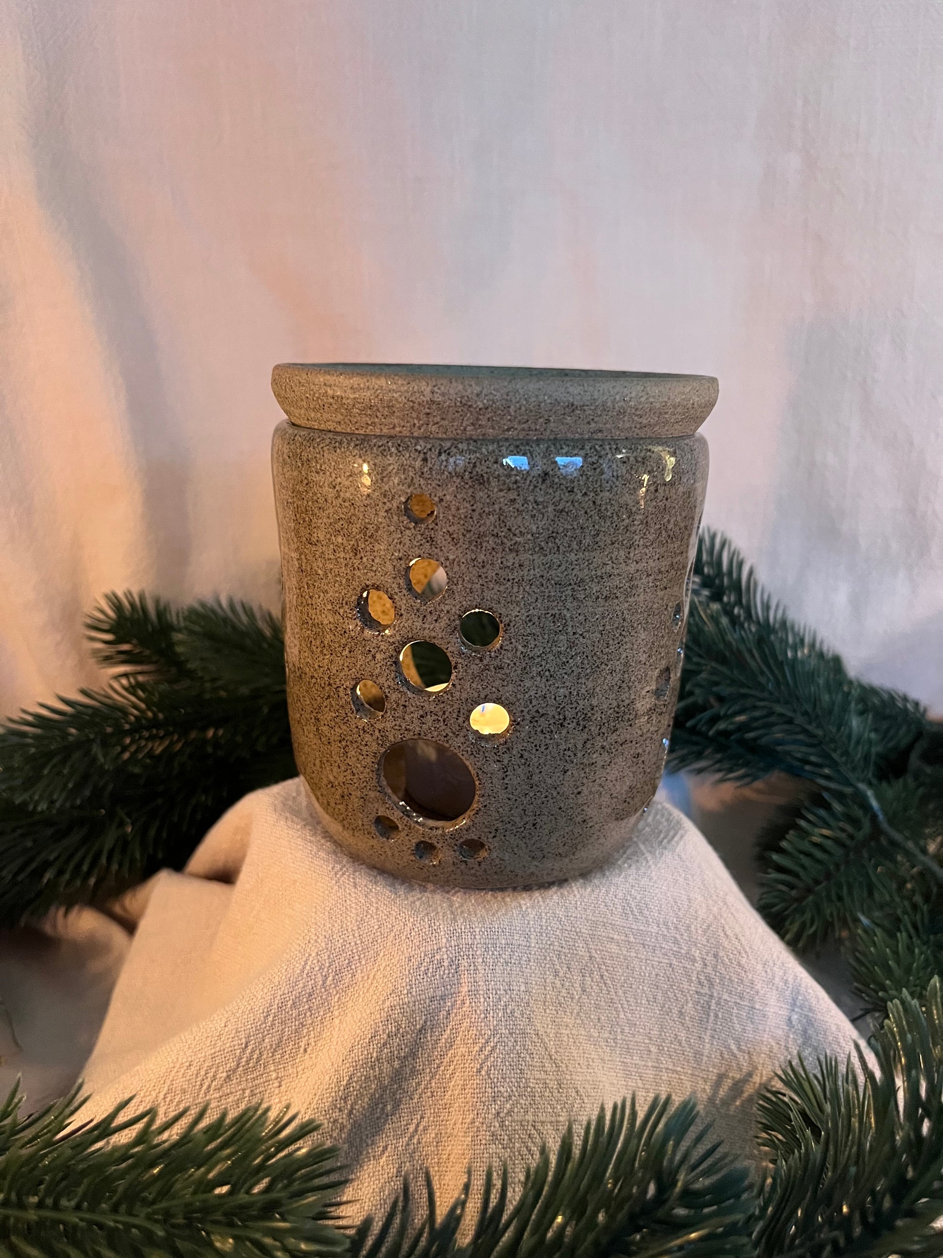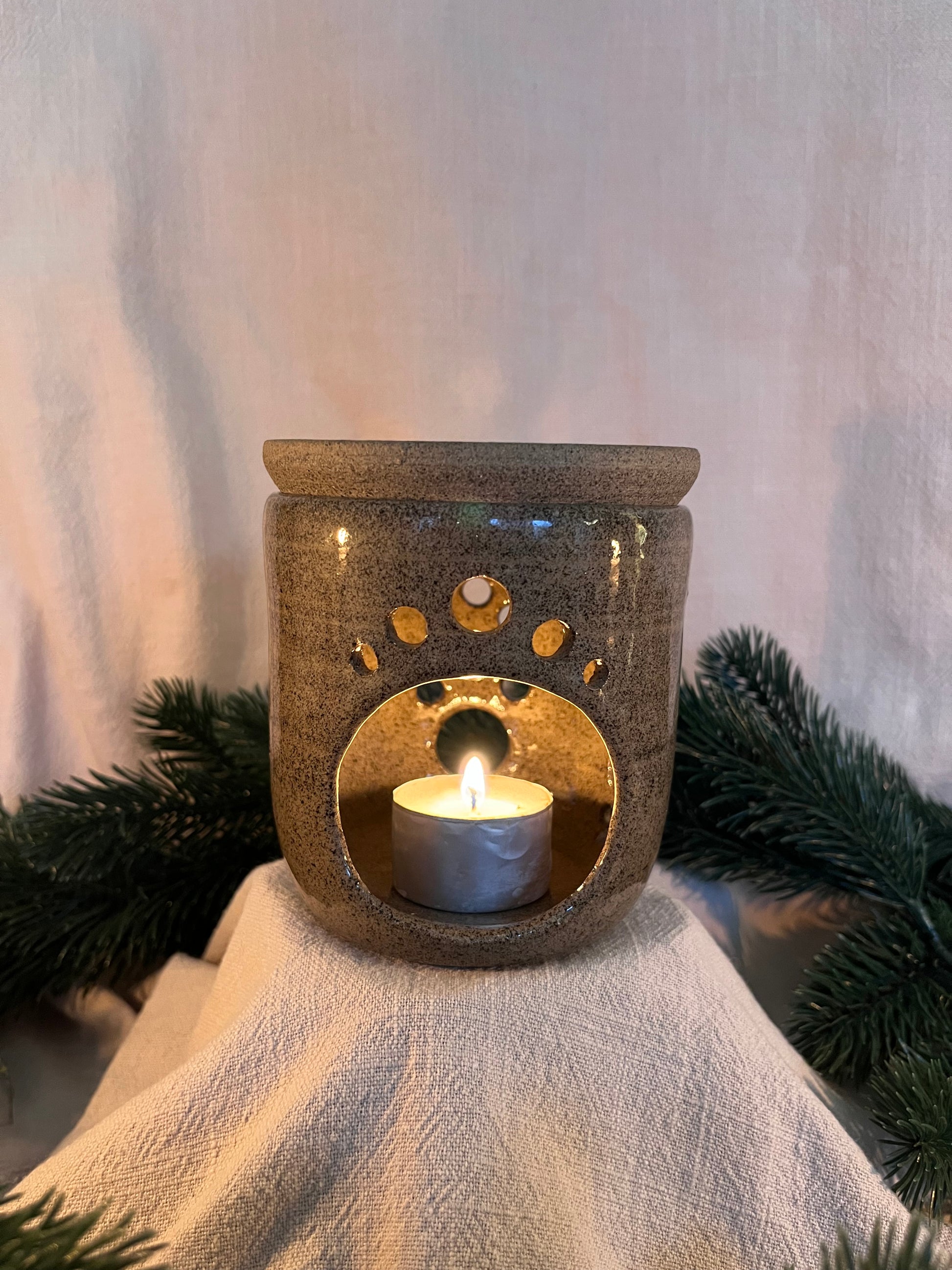 Drejad aromalampa i grov stengodslera. Glaserad i transparent glasyr.
