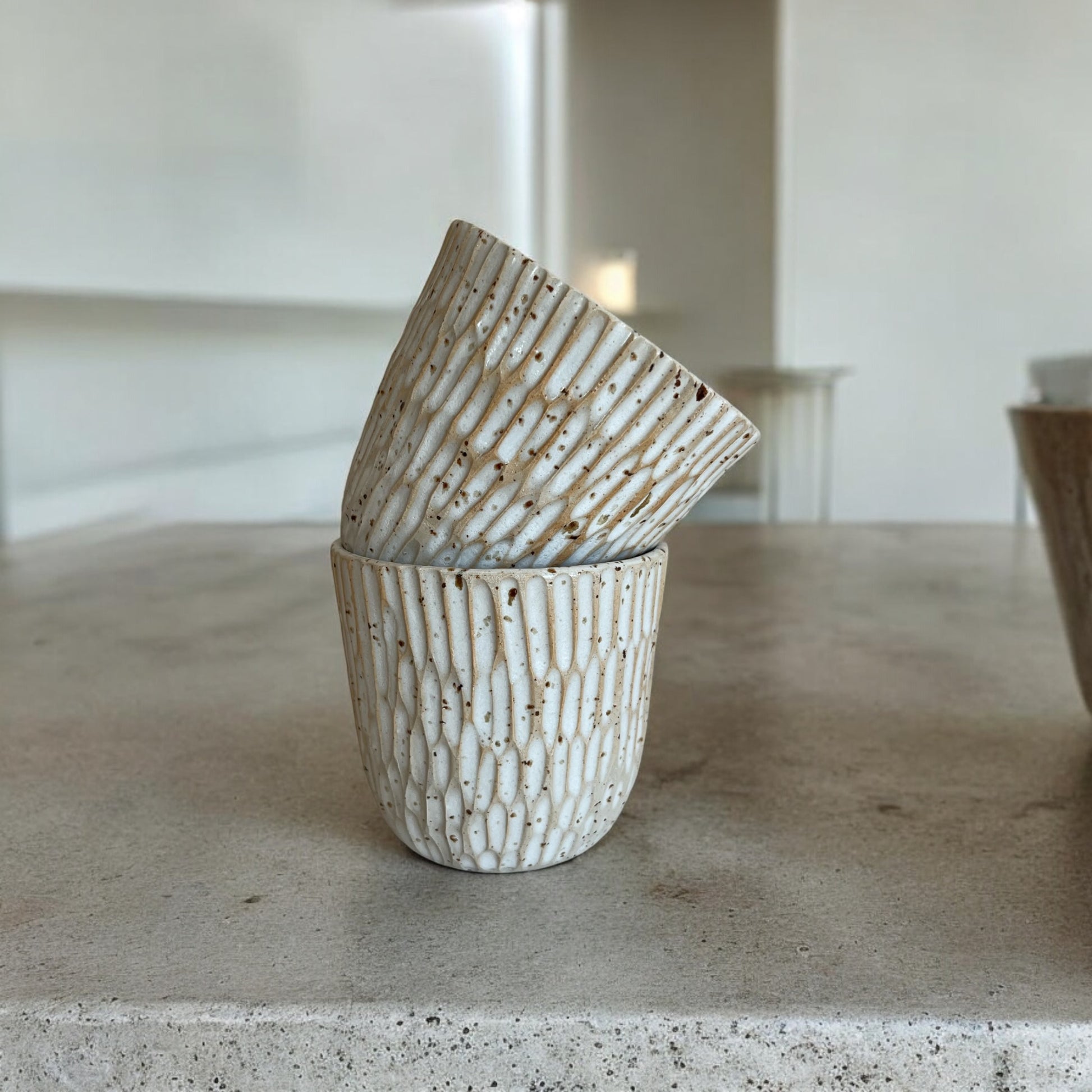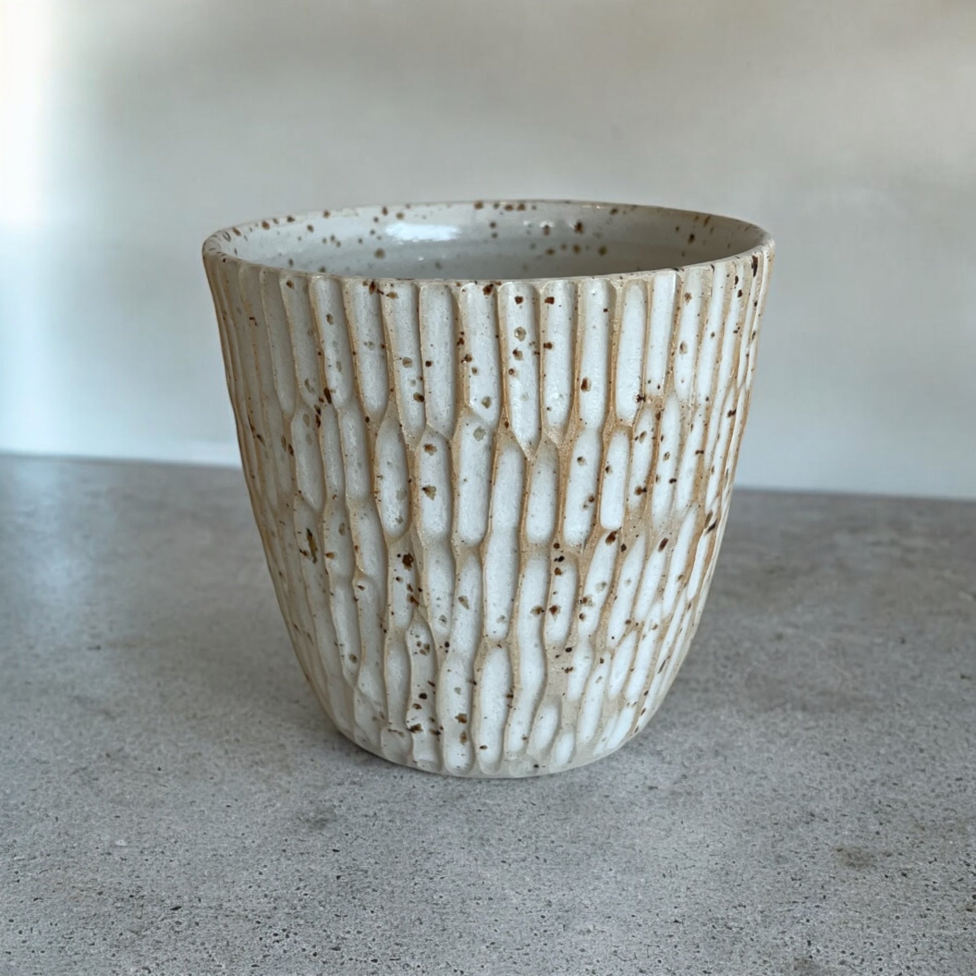 Koppen är karvad för hand och glaserad i en vit matt glasyr.