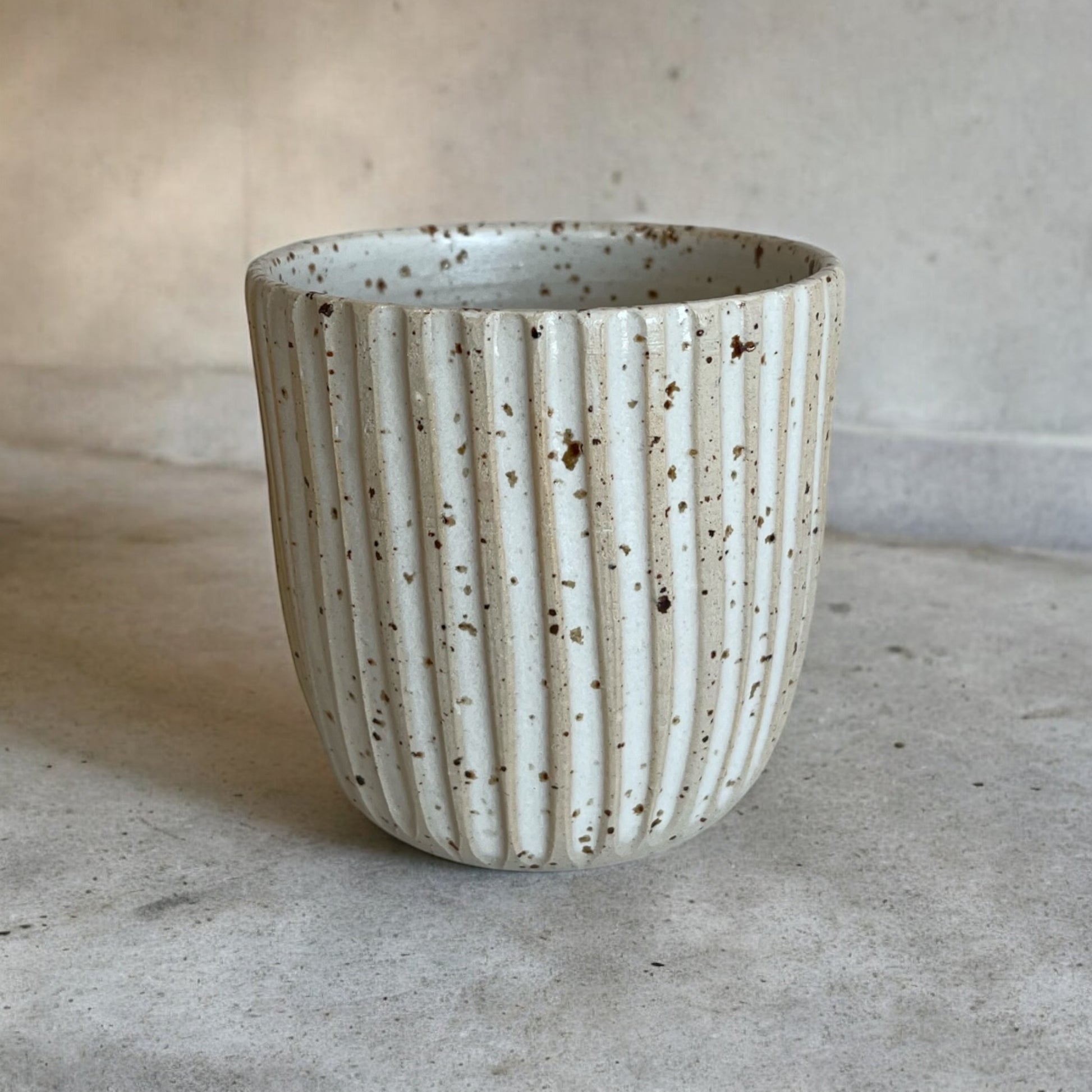 En drejad kopp i lavaprickig stengodslera.