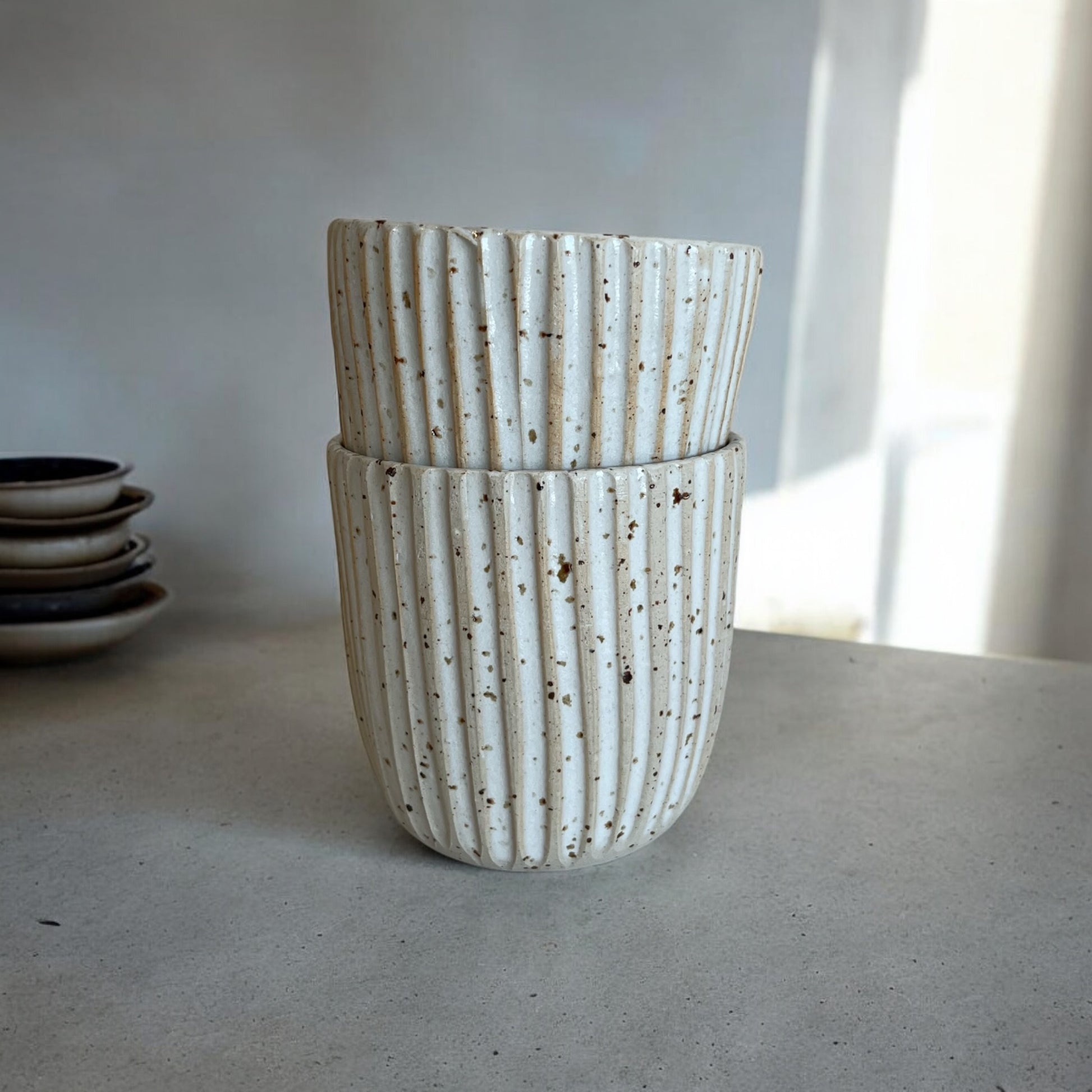 Koppen är karvad för hand och glaserad i en vit matt glasyr.