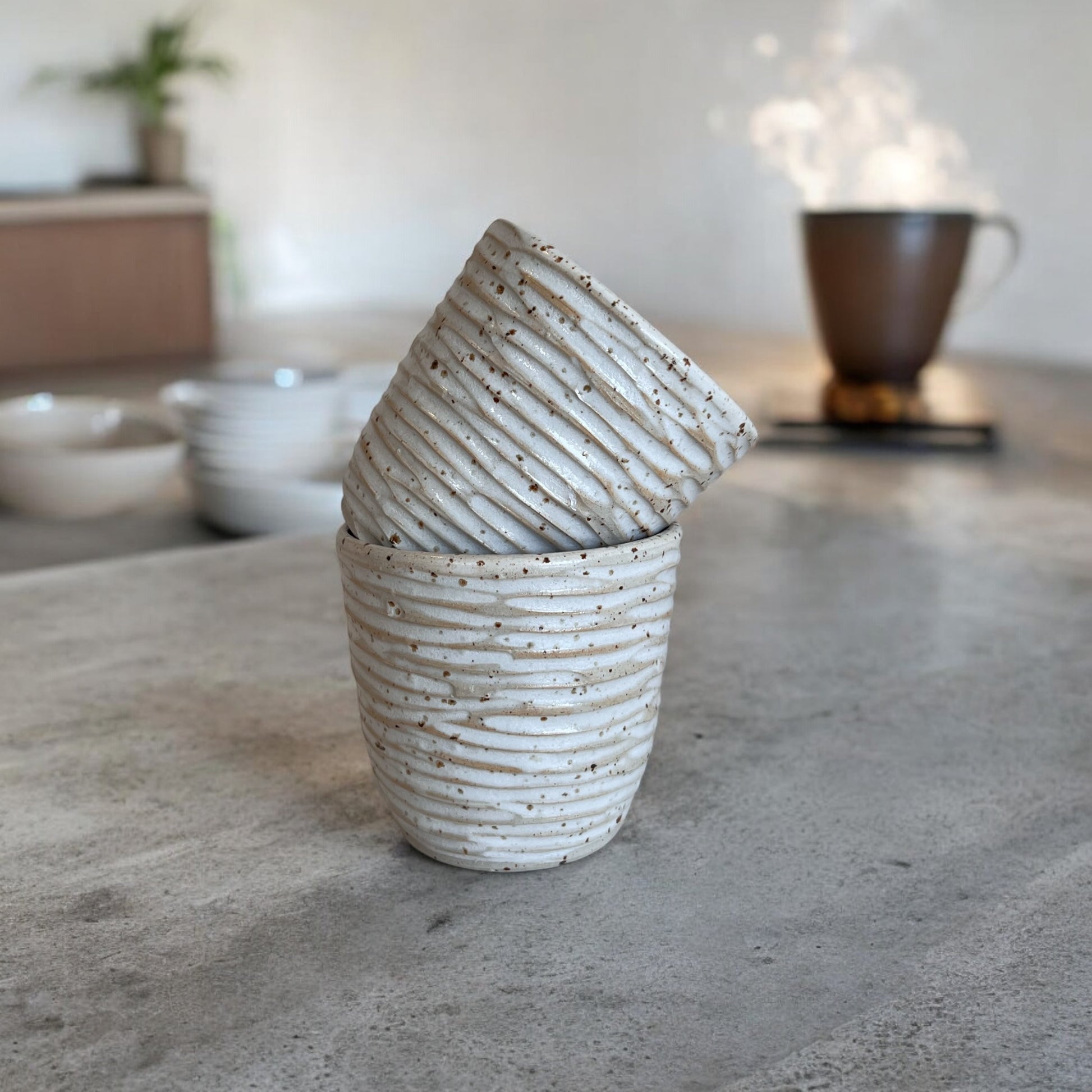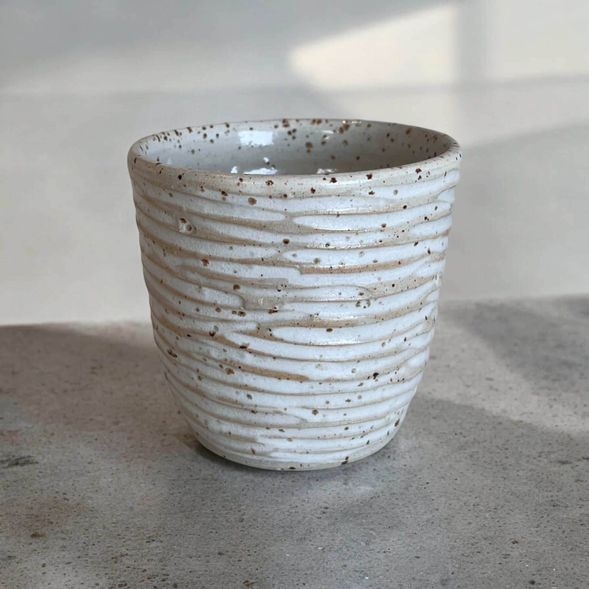 Koppen är karvad för hand och glaserad i en vit matt glasyr.