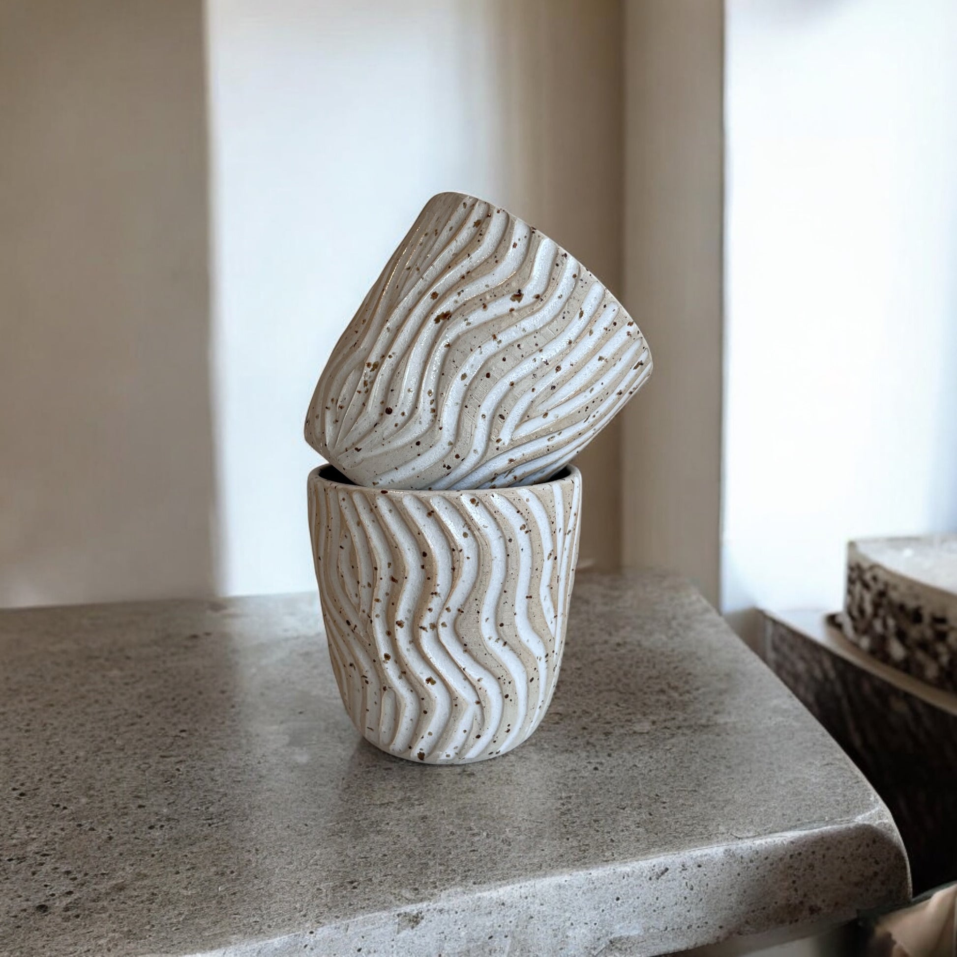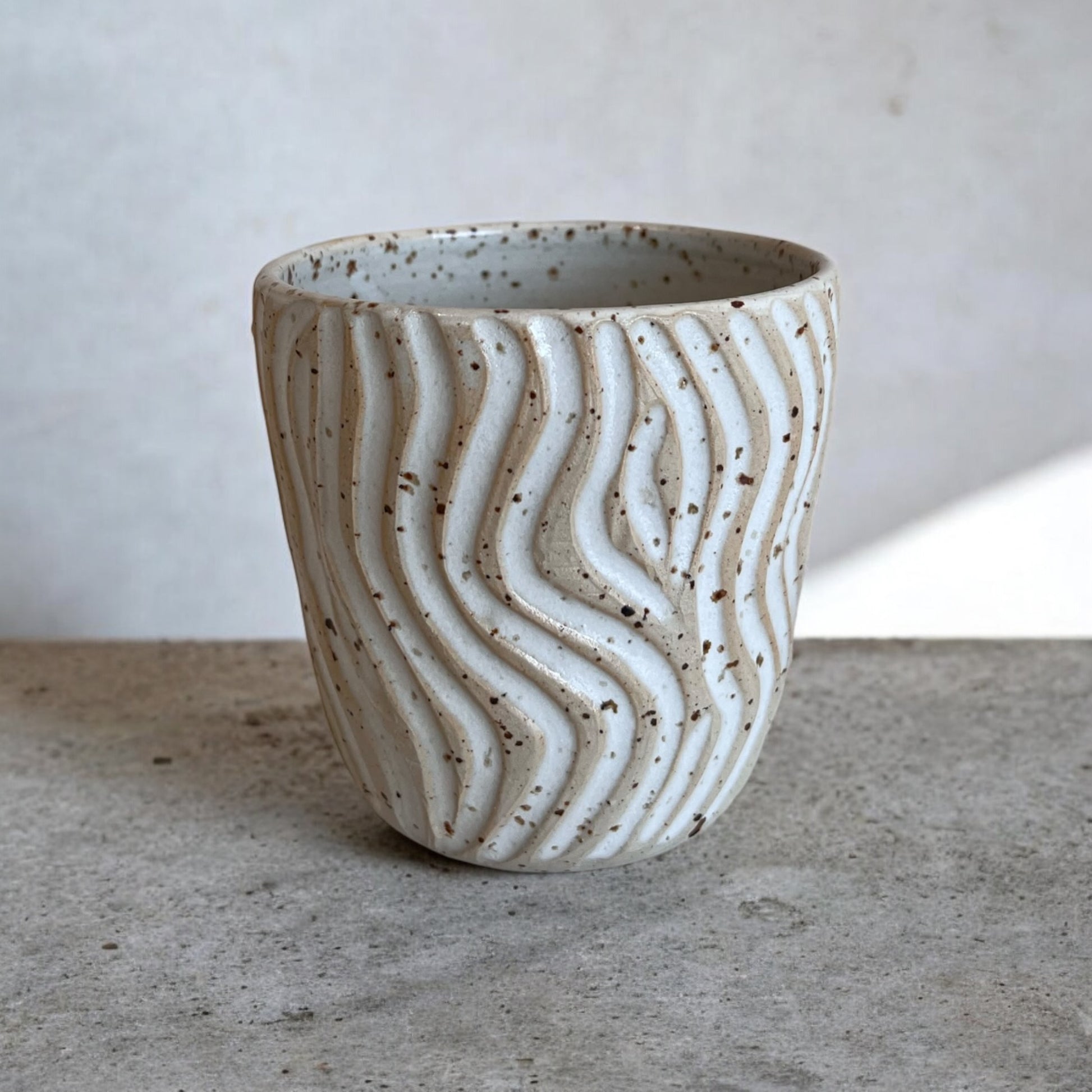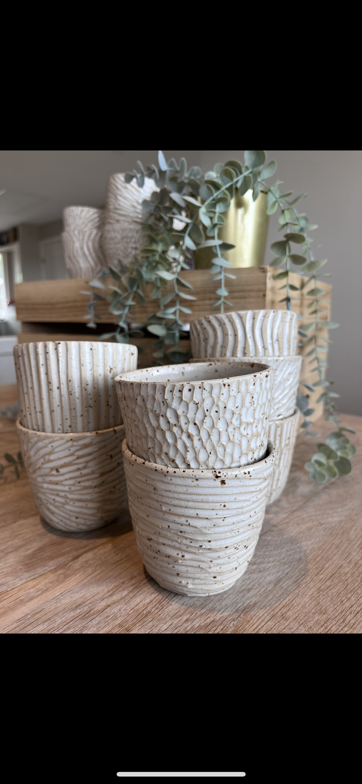 Koppen är karvad för hand och glaserad i en vit matt glasyr.