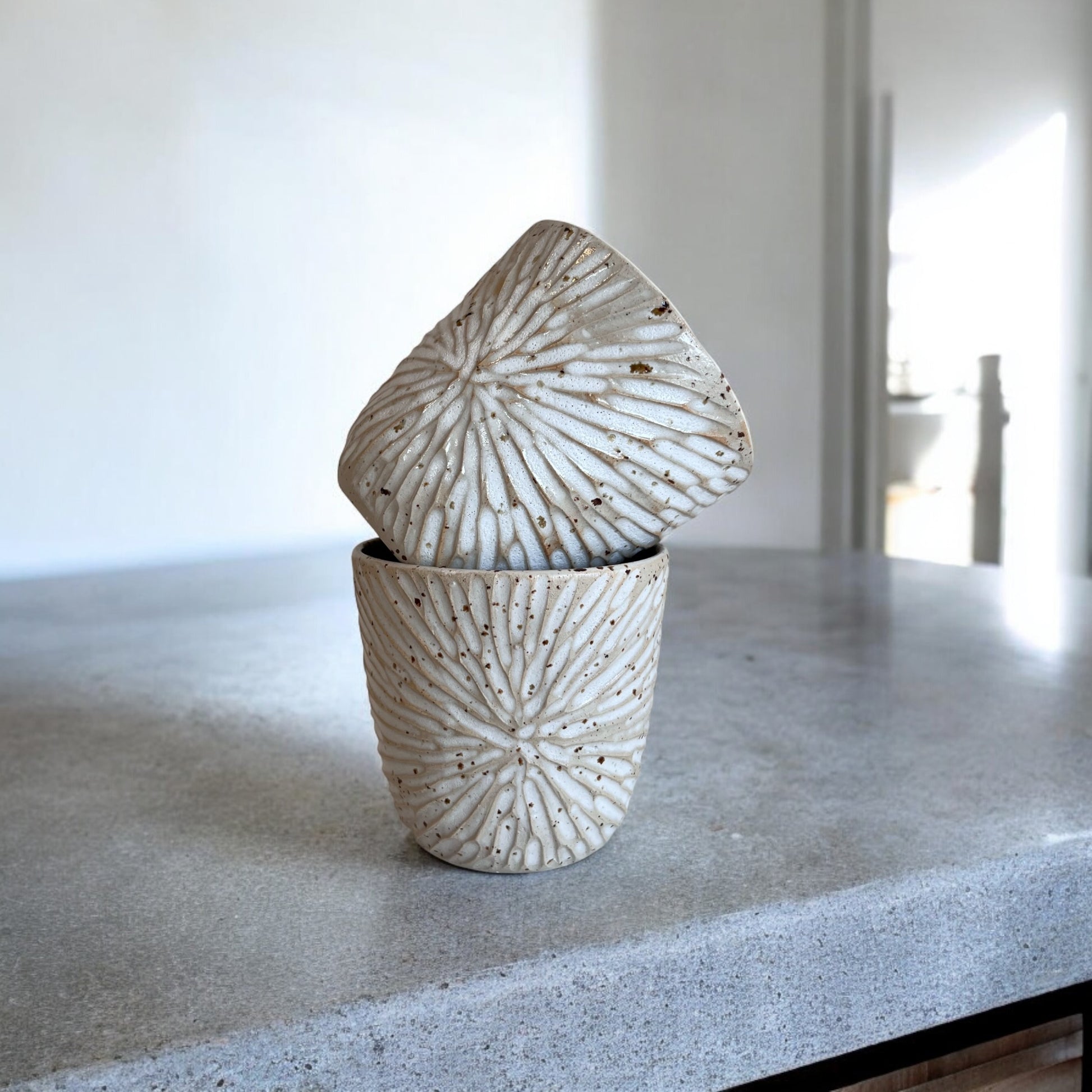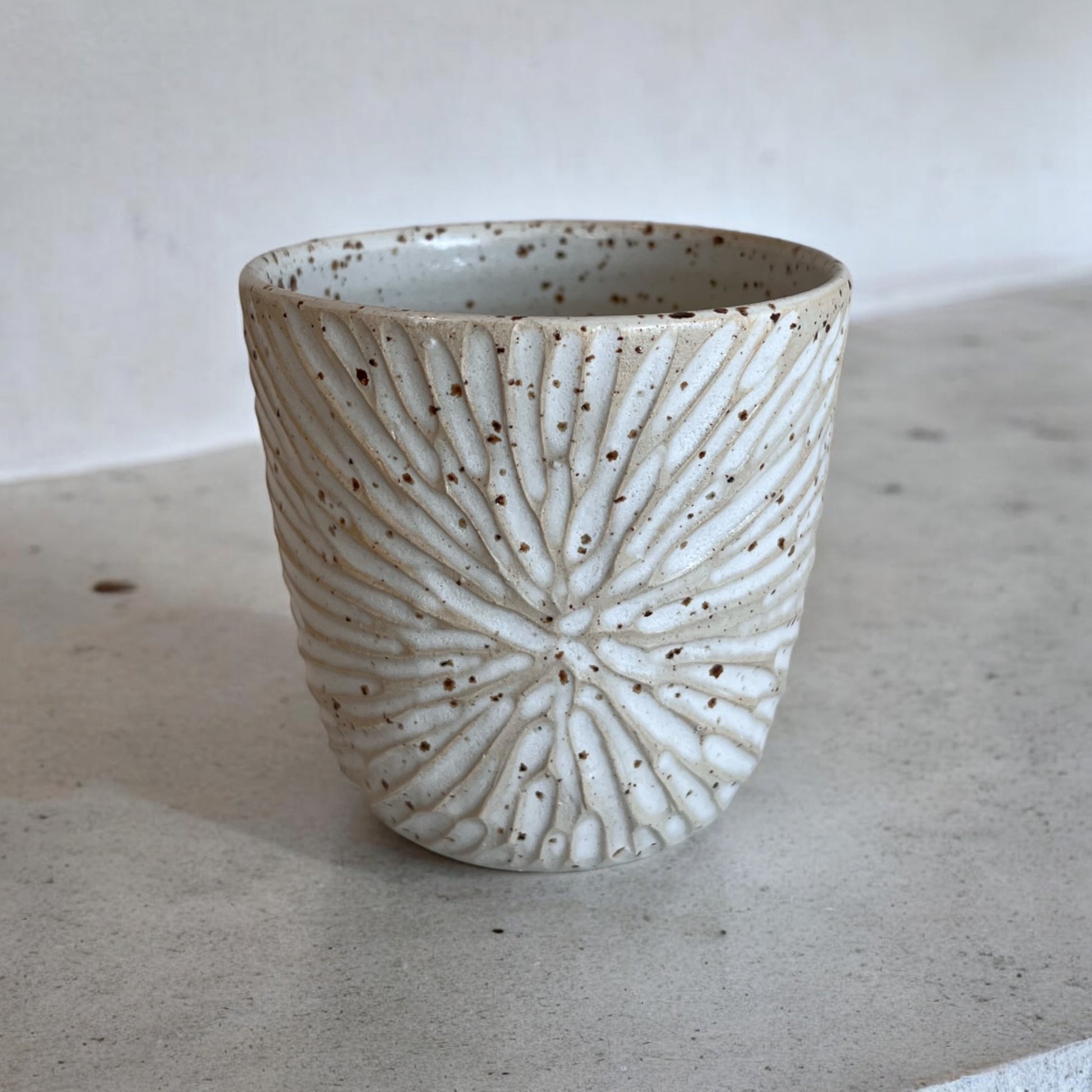 Koppen är karvad för hand och glaserad i en vit matt glasyr.