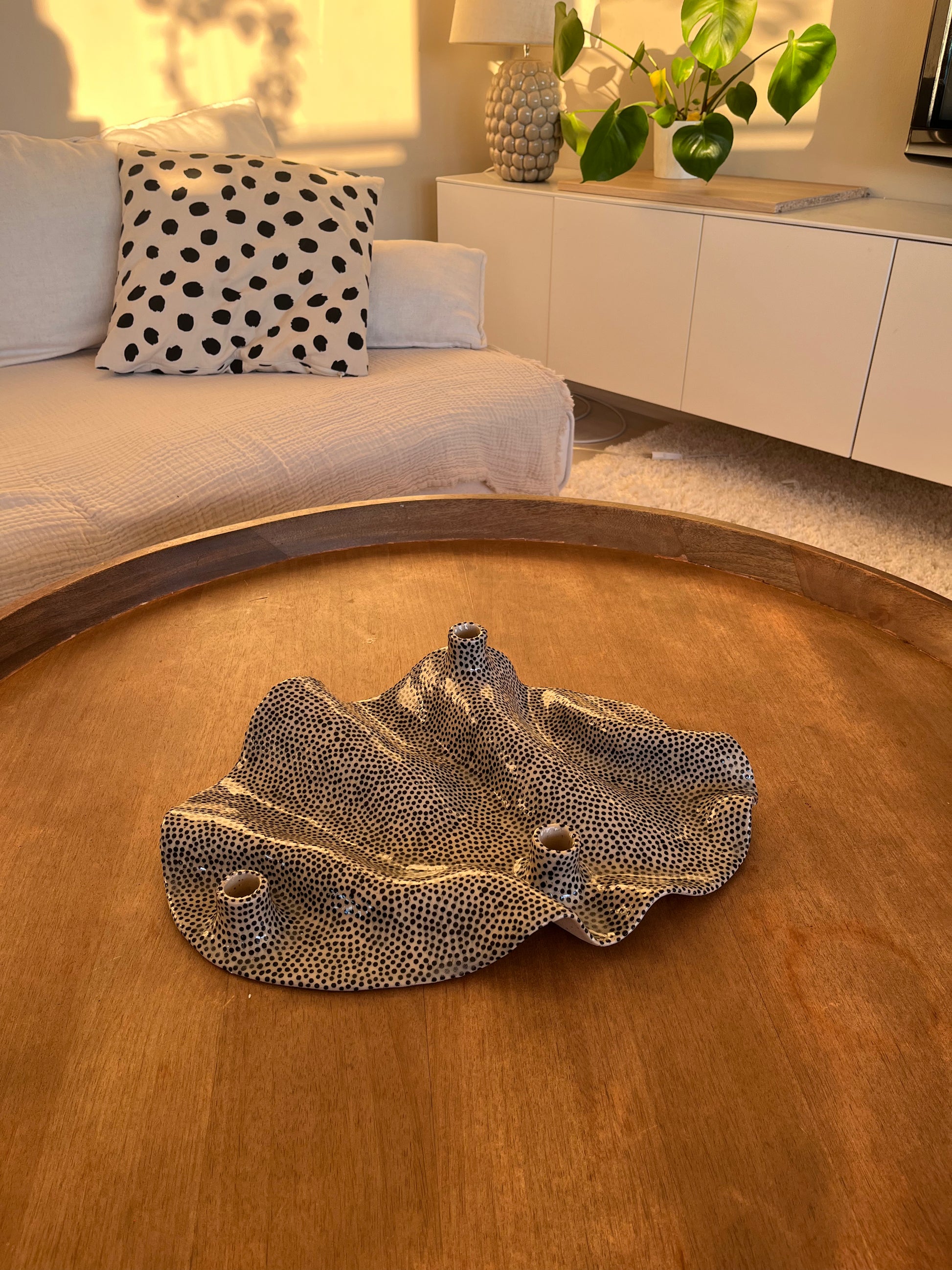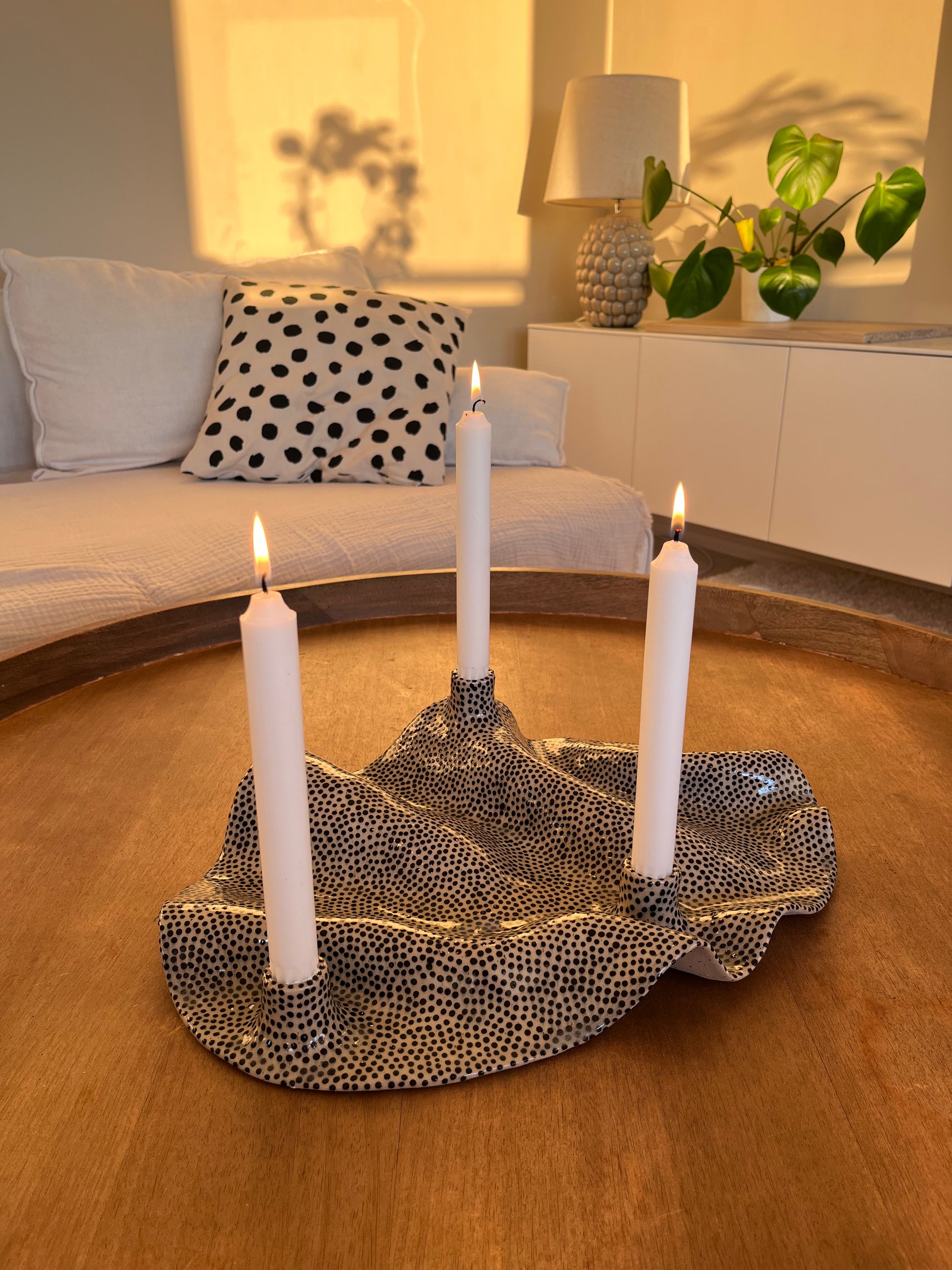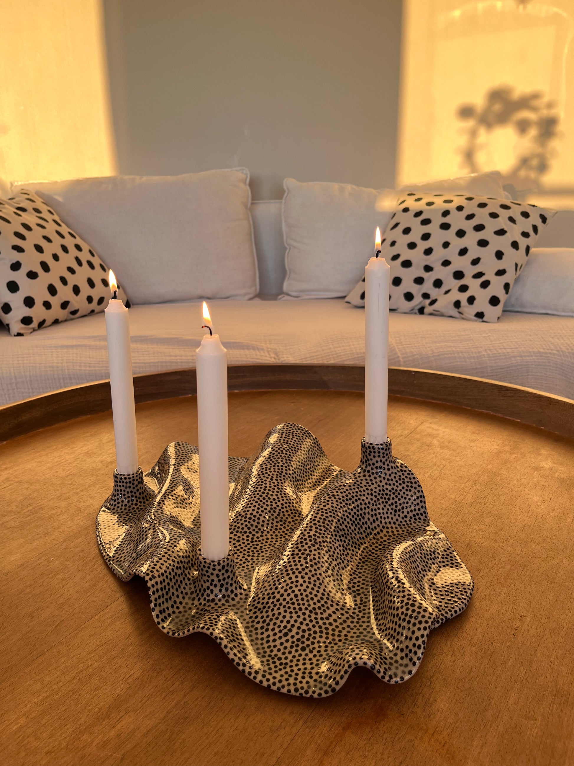Ljusstake i stengodslera och handmålade prickar.