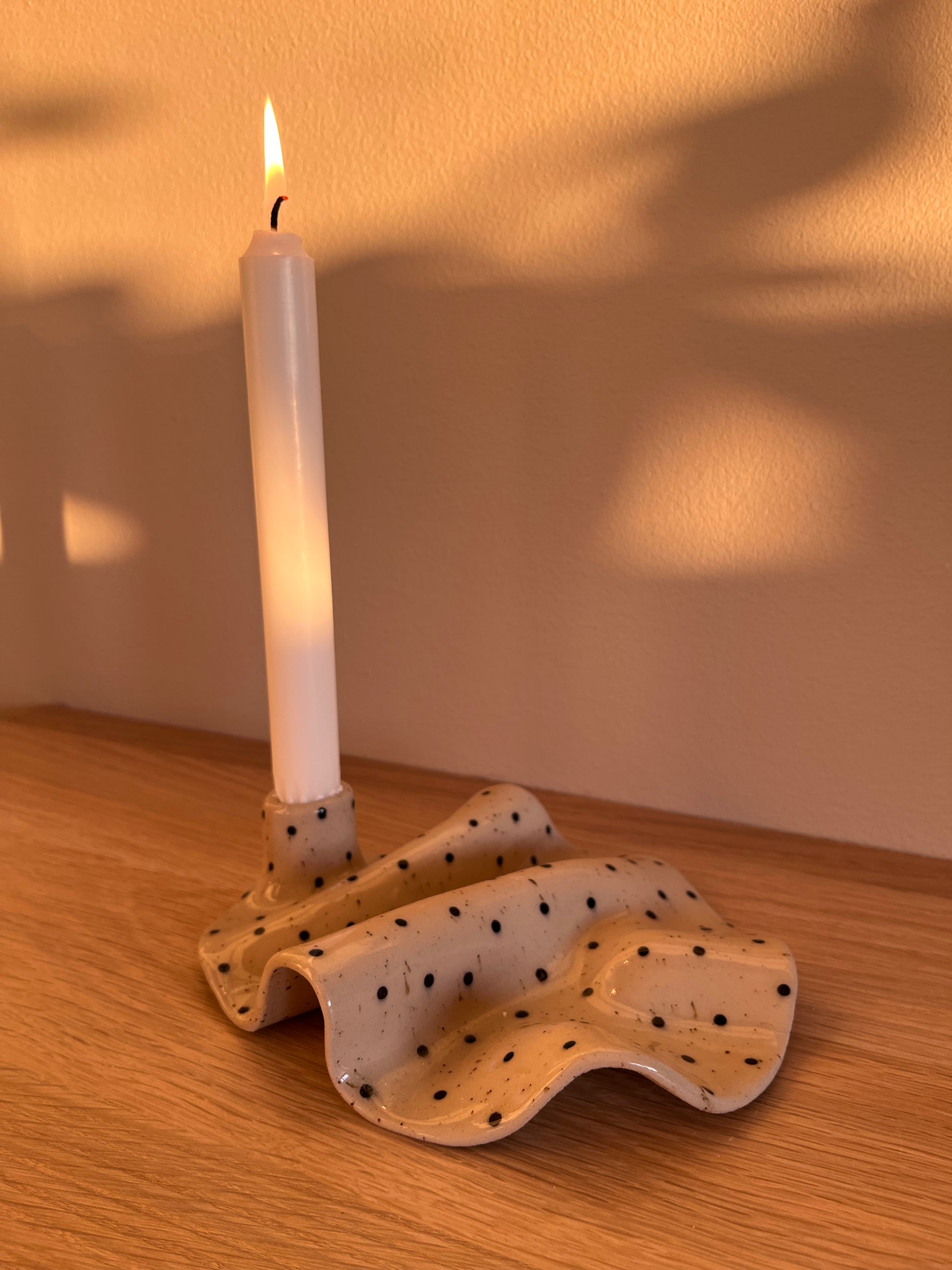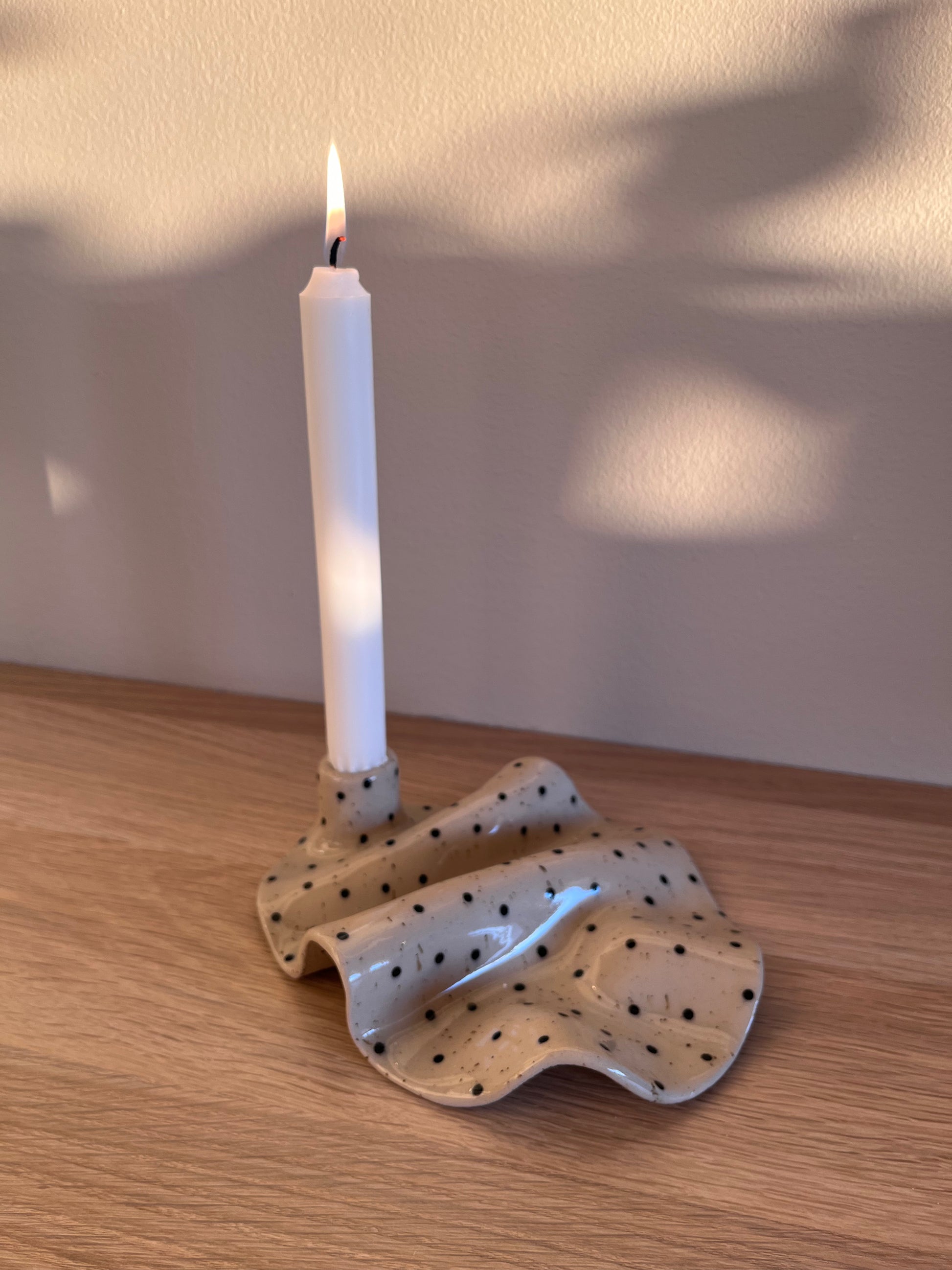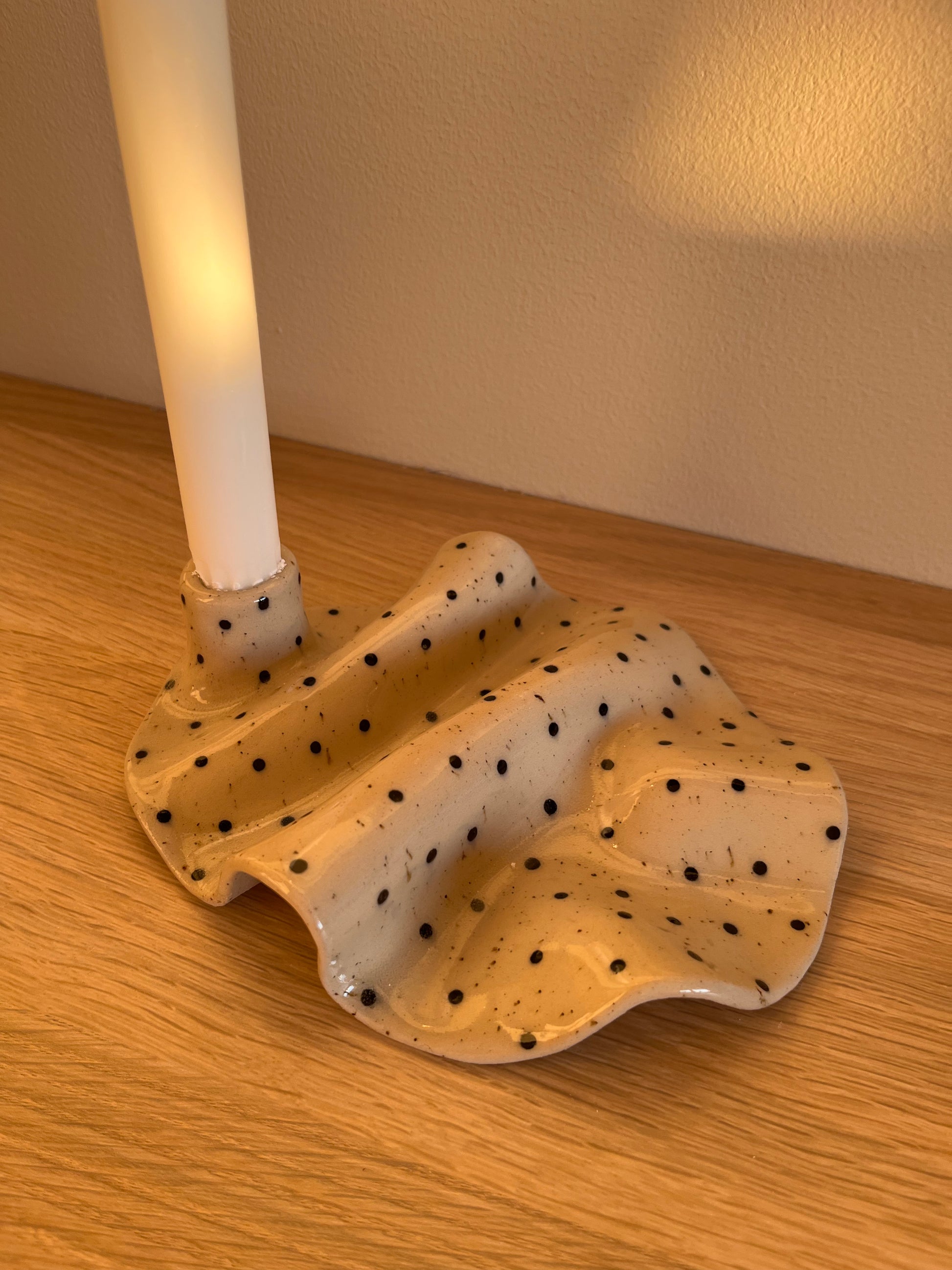 Ljusstake i lavaprickig stengodslera och handmålade prickar.