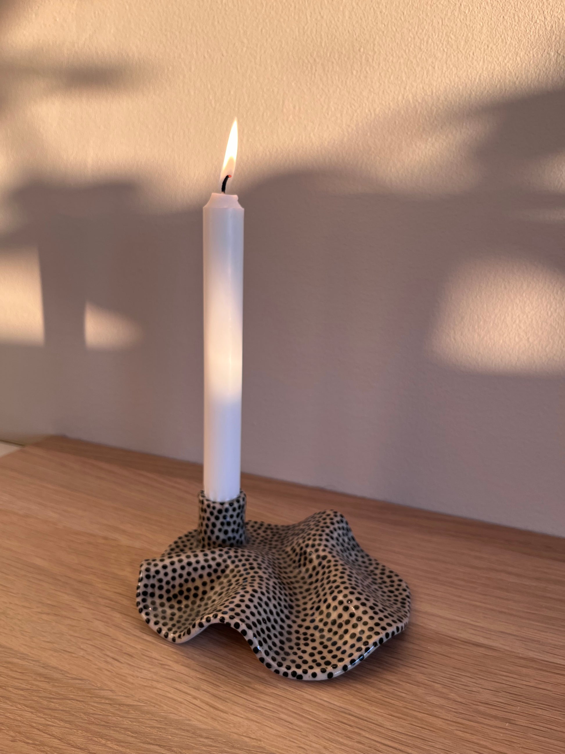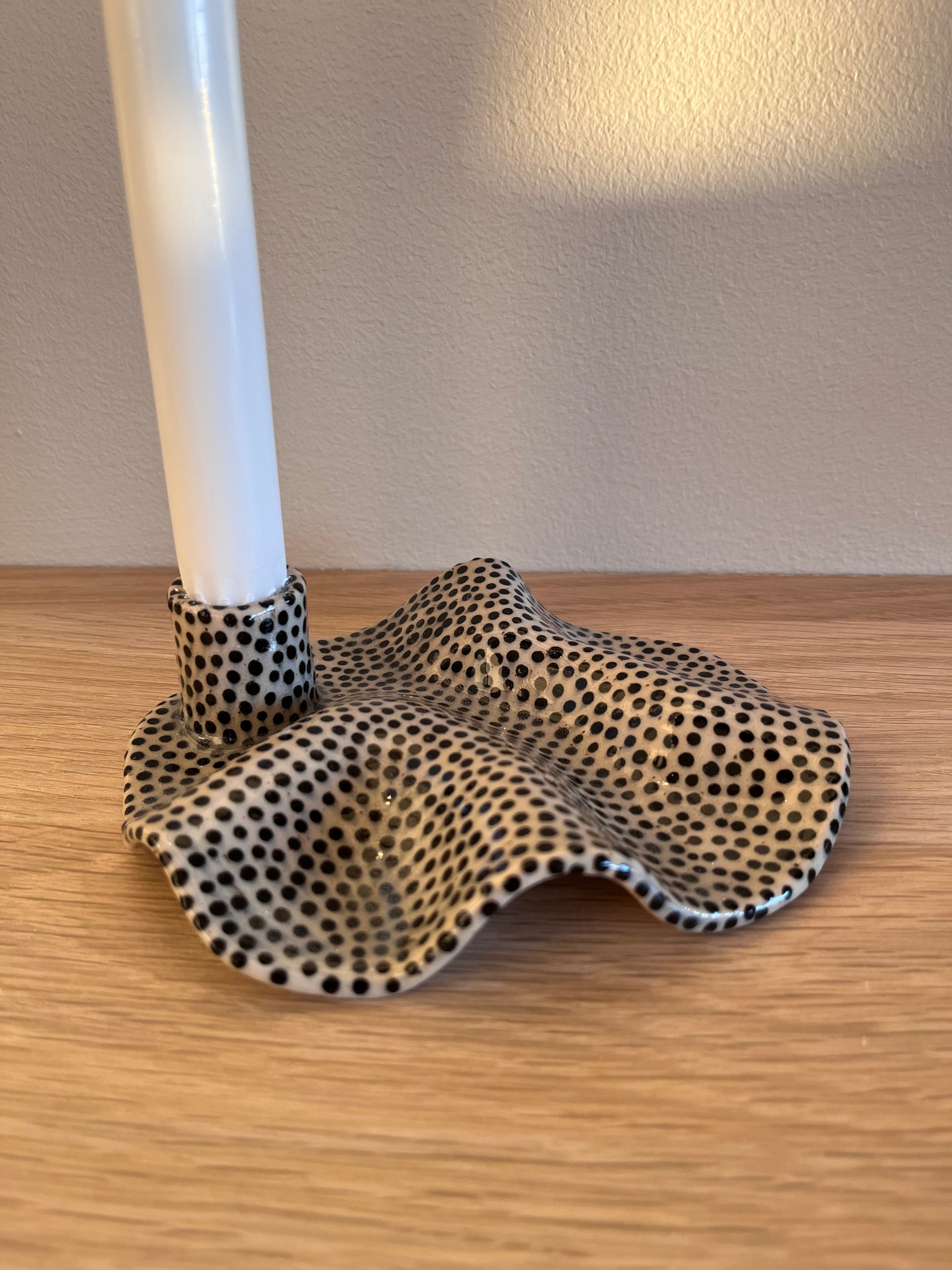Ljusstake i stengodslera och handmålade prickar.