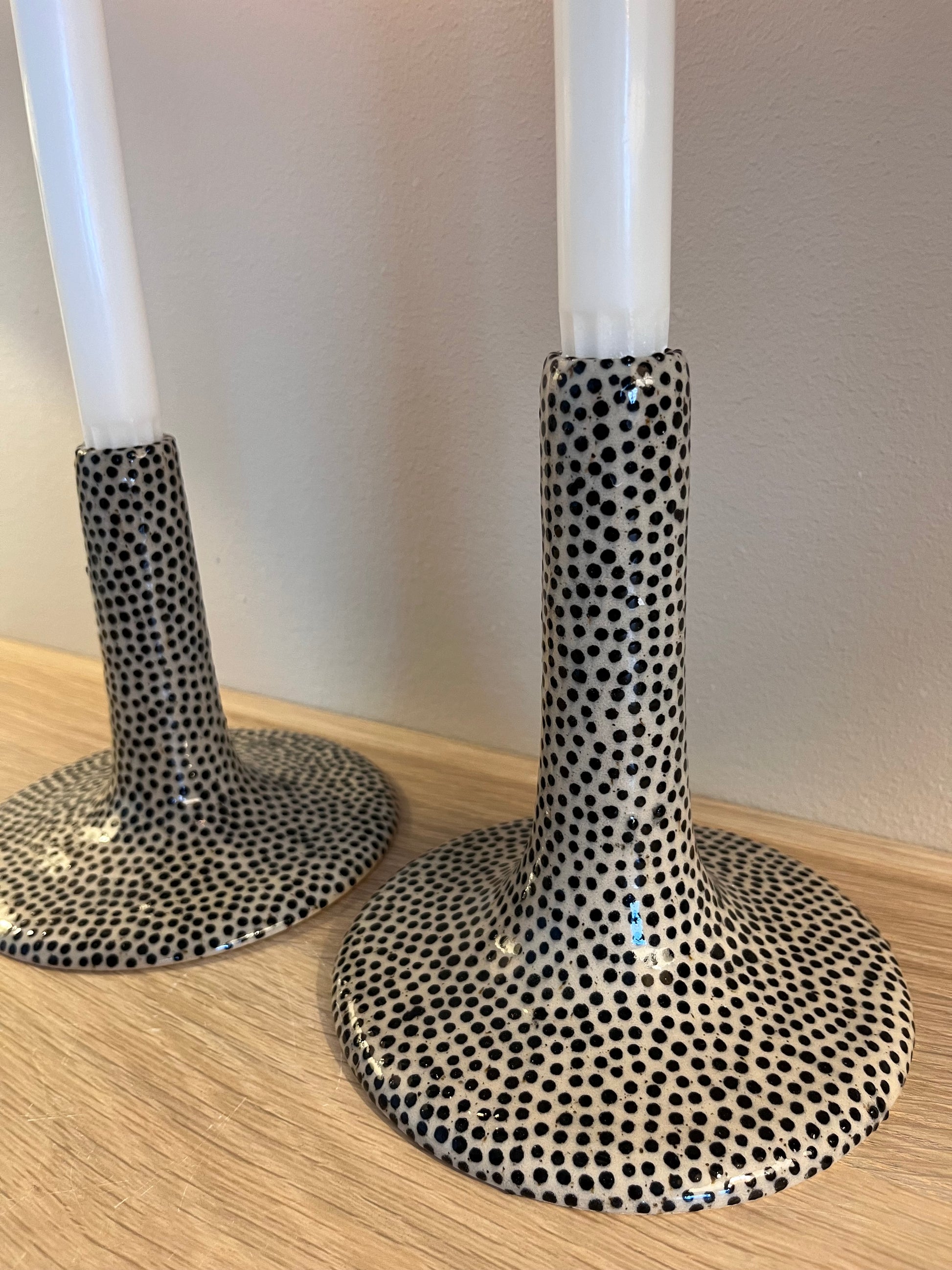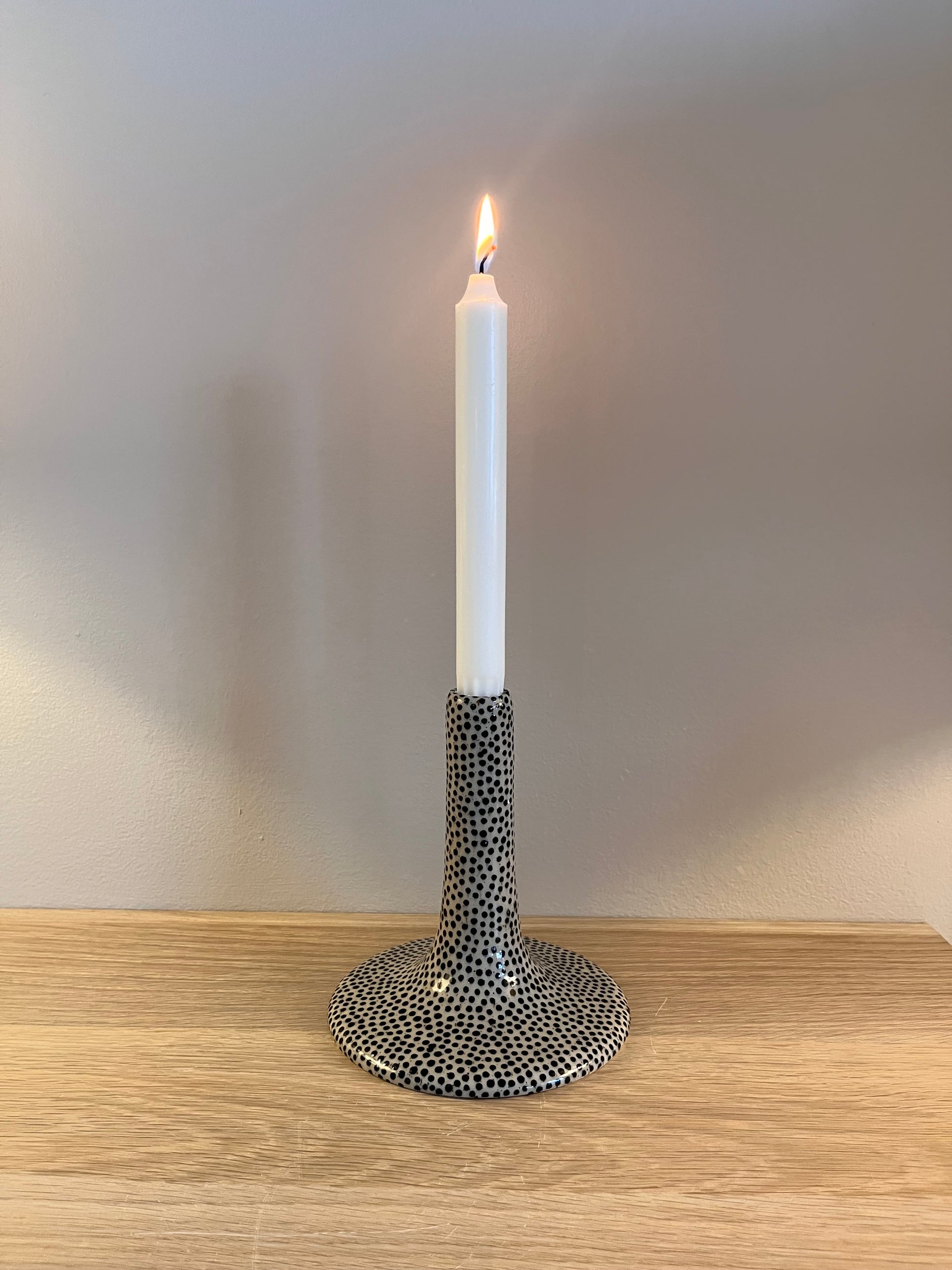 Drejad ljusstake i stengodslera. Handmålade prickar och glaserad i en transparent glasyr.