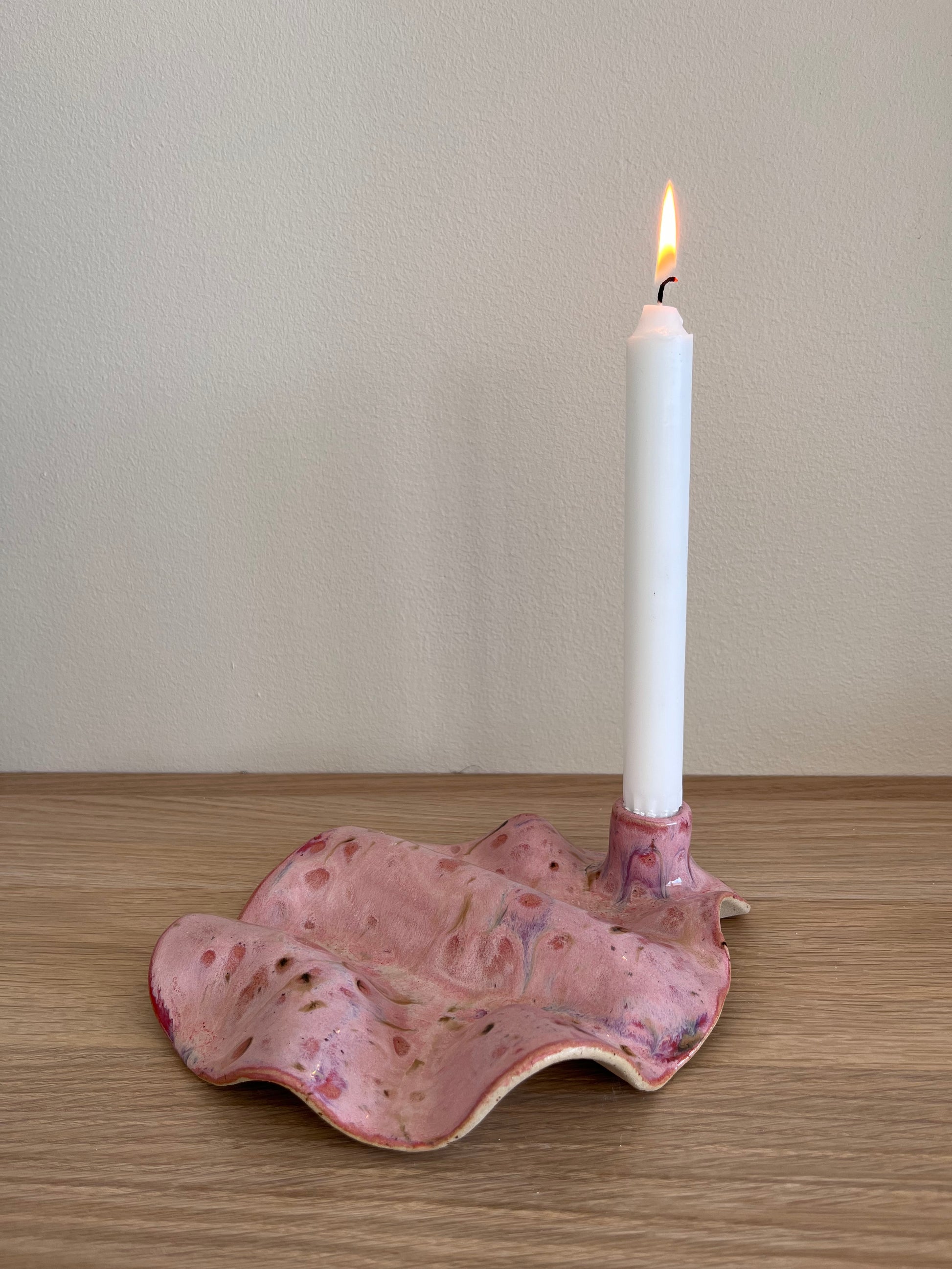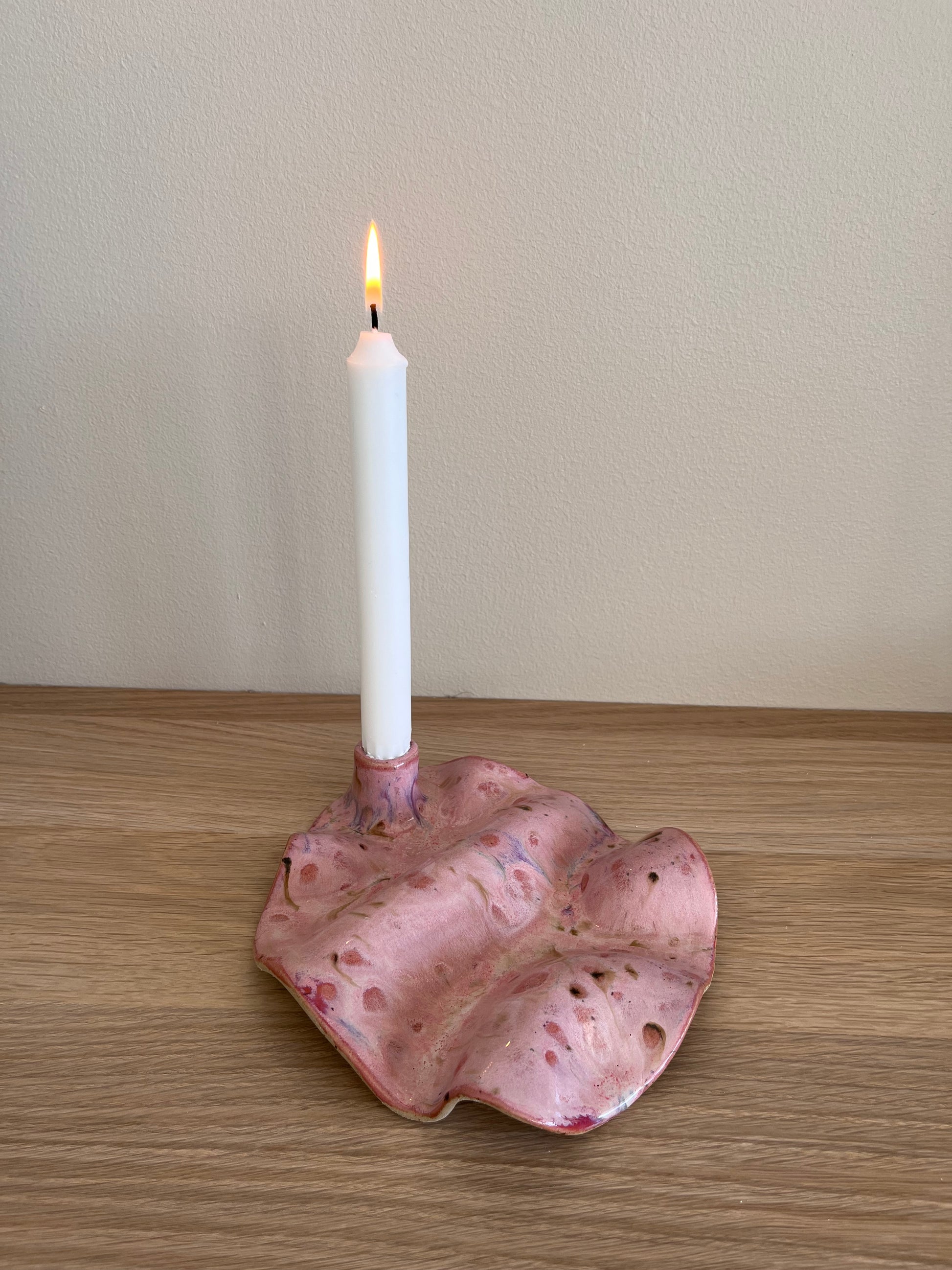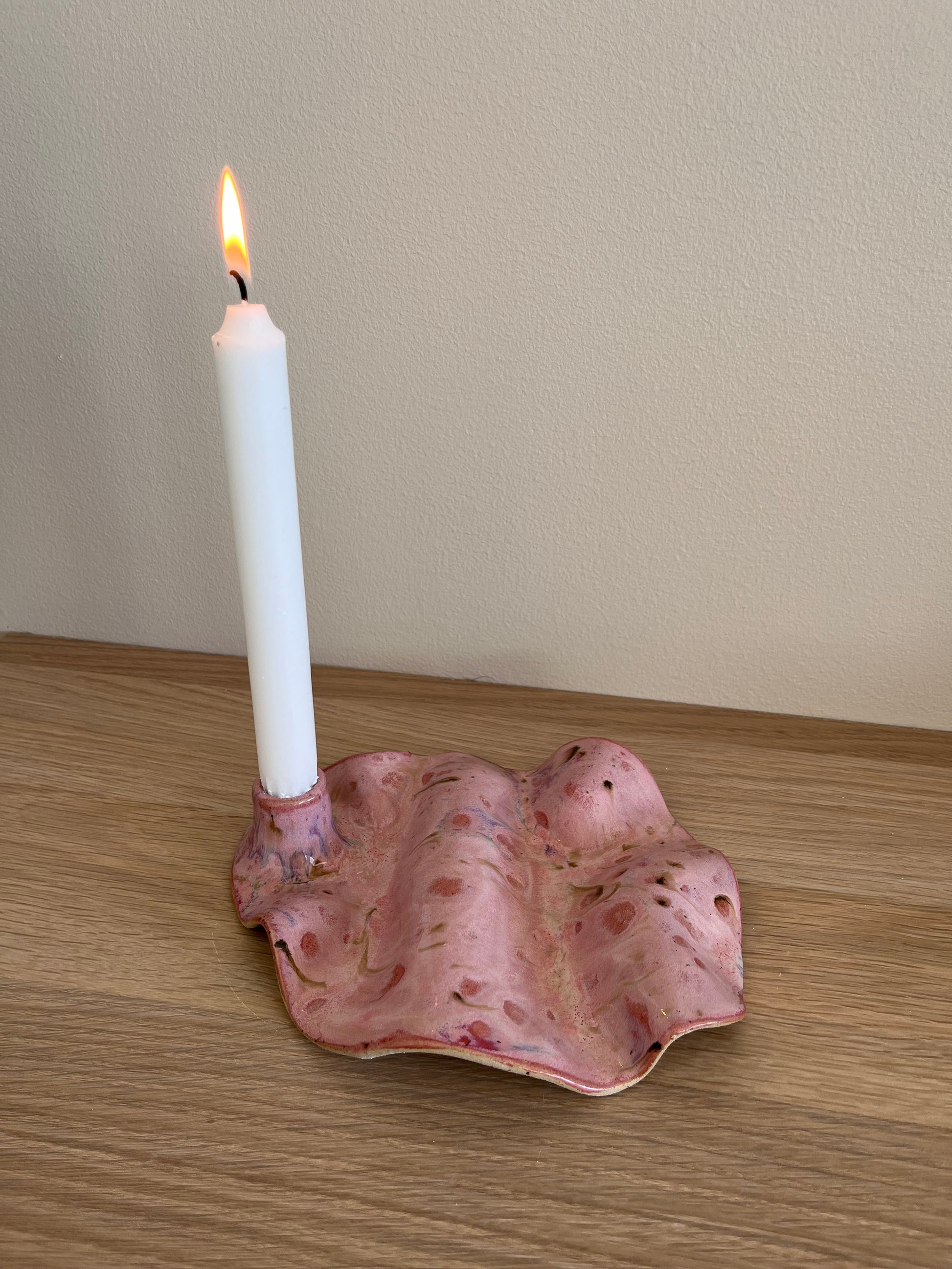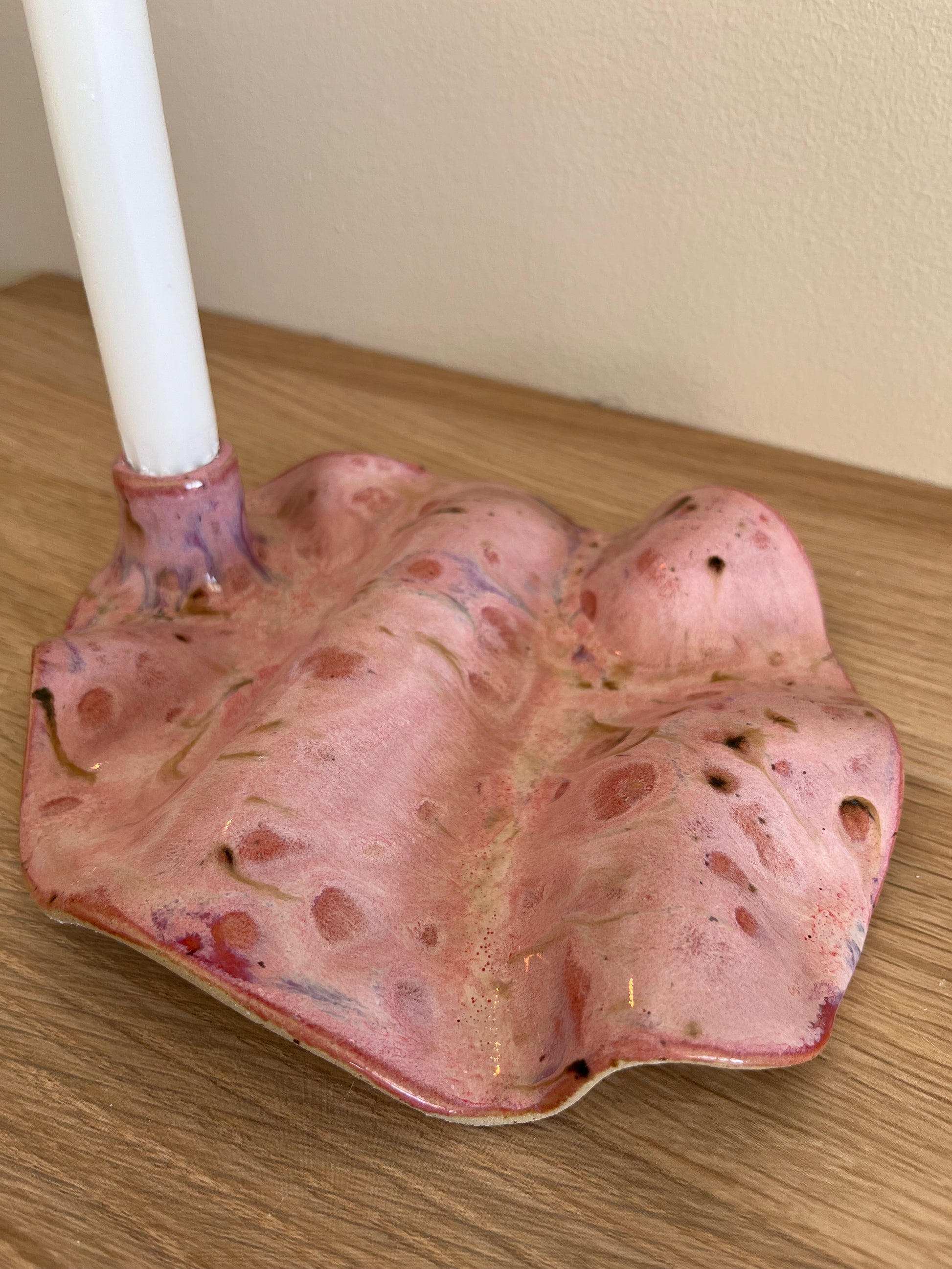Ljusstake i lavaprickig stengodslera. Glaserad i en härlig rosamelerad blank glasyr.