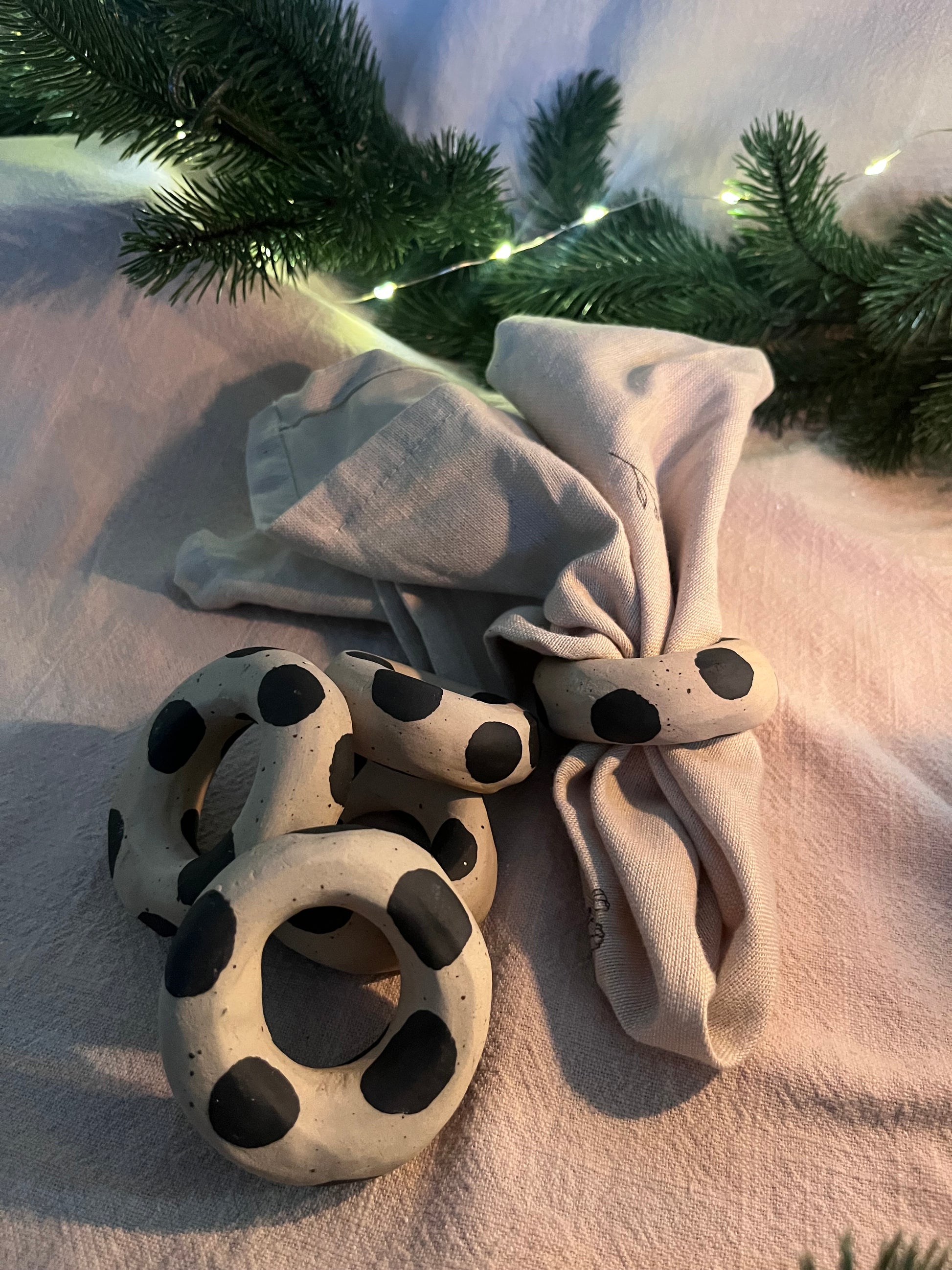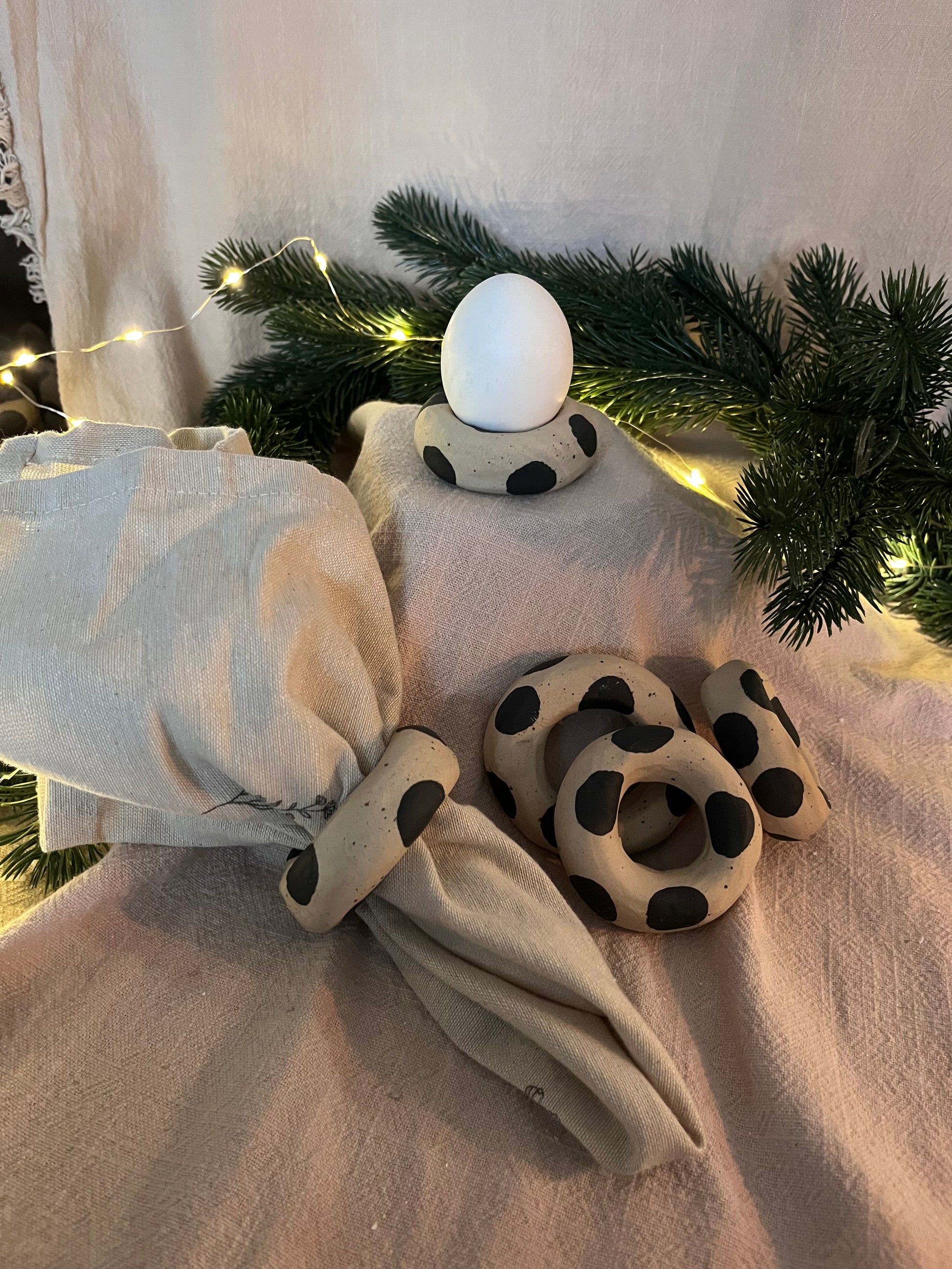 Skulpterade ringar i stengodslera. Dekorerade med stora svarta prickar. Oglaserade.