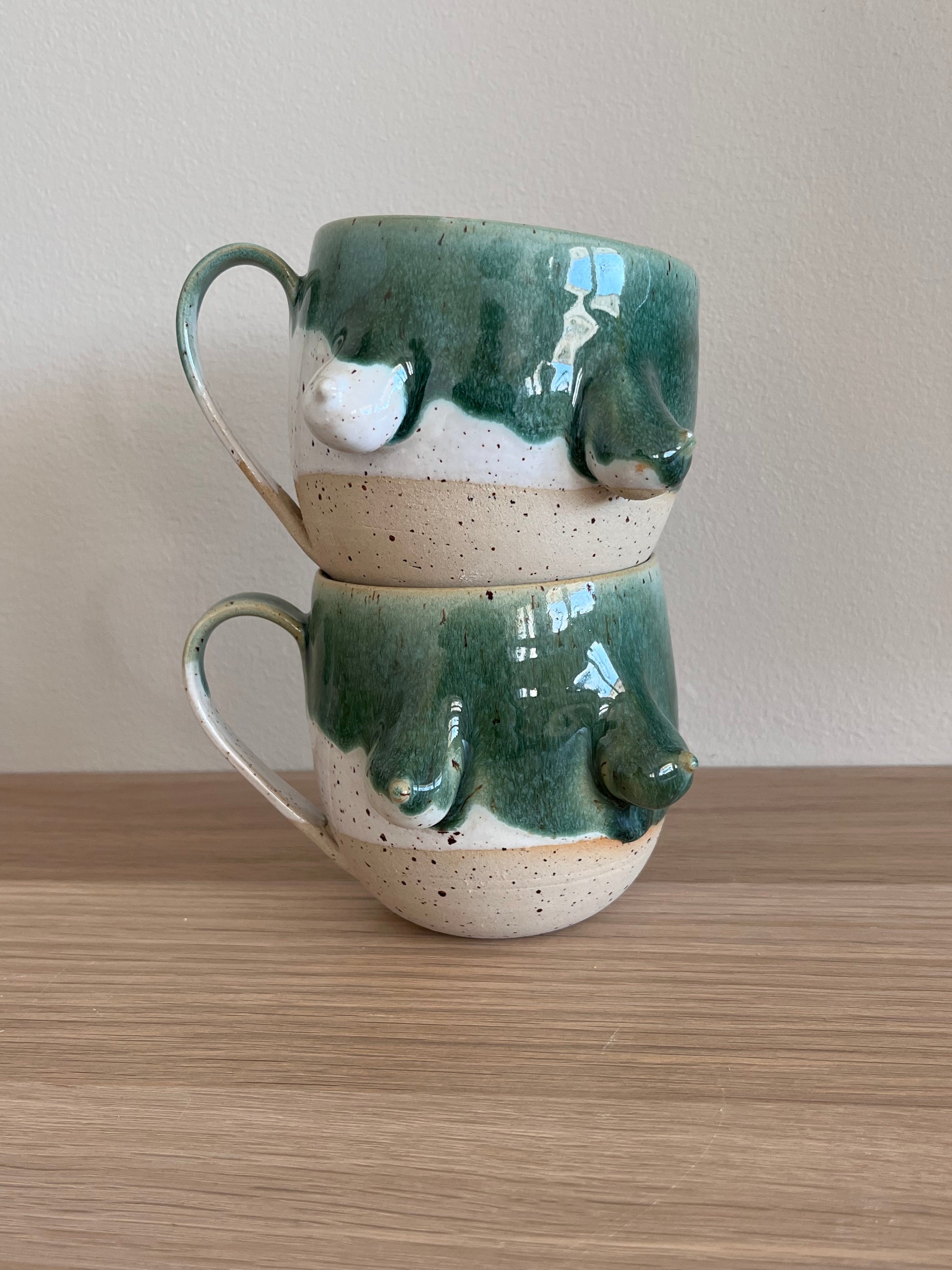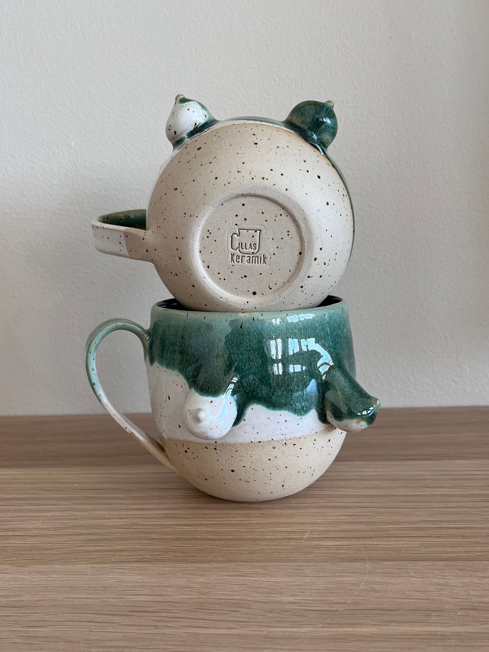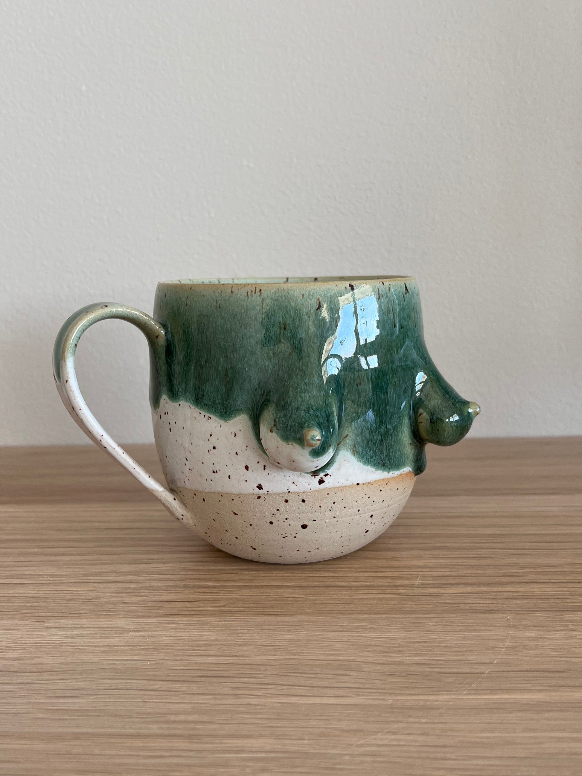 Tuttkopp med en härlig glasyrdrip i lavaprickig stengodslera.