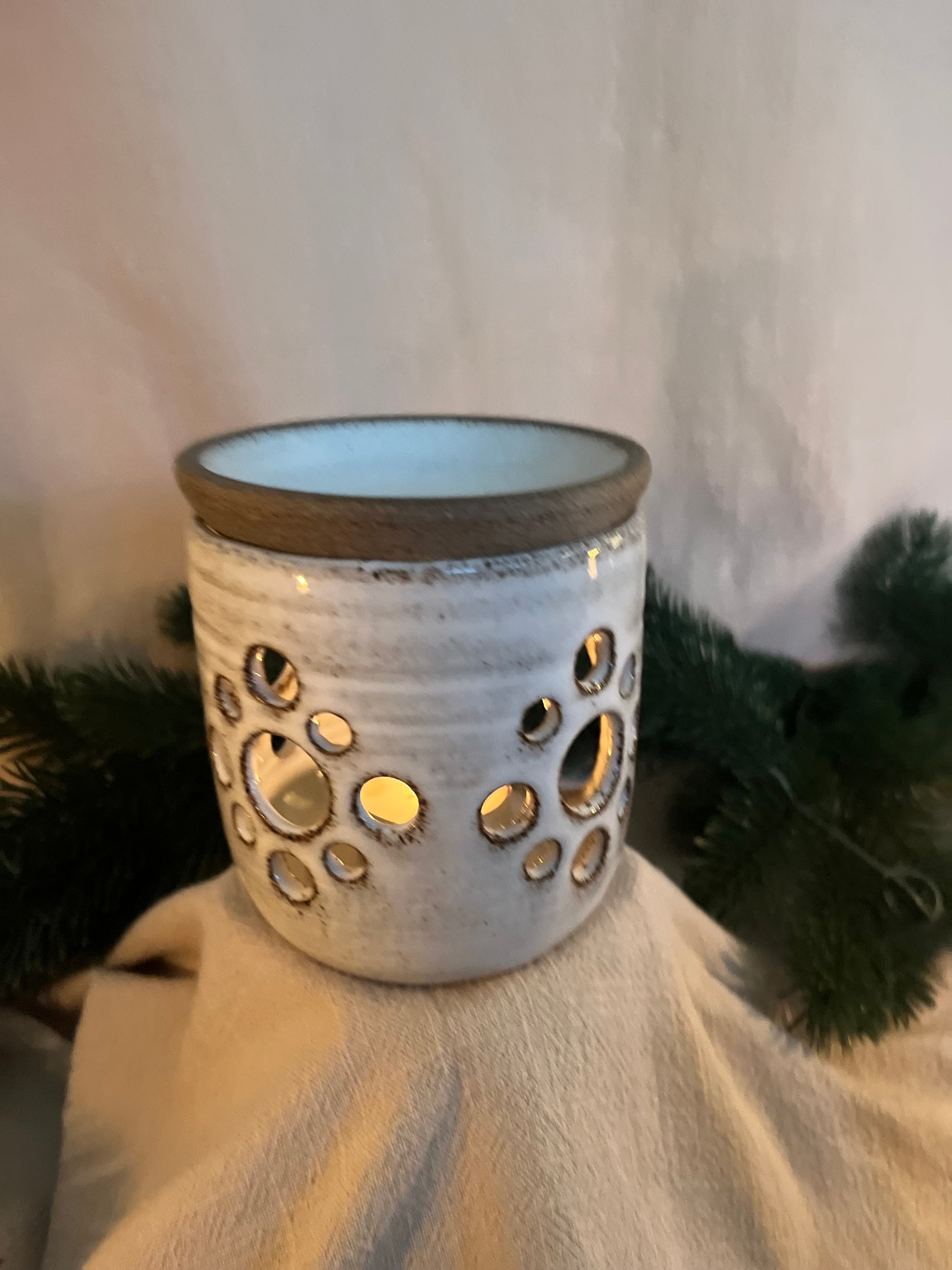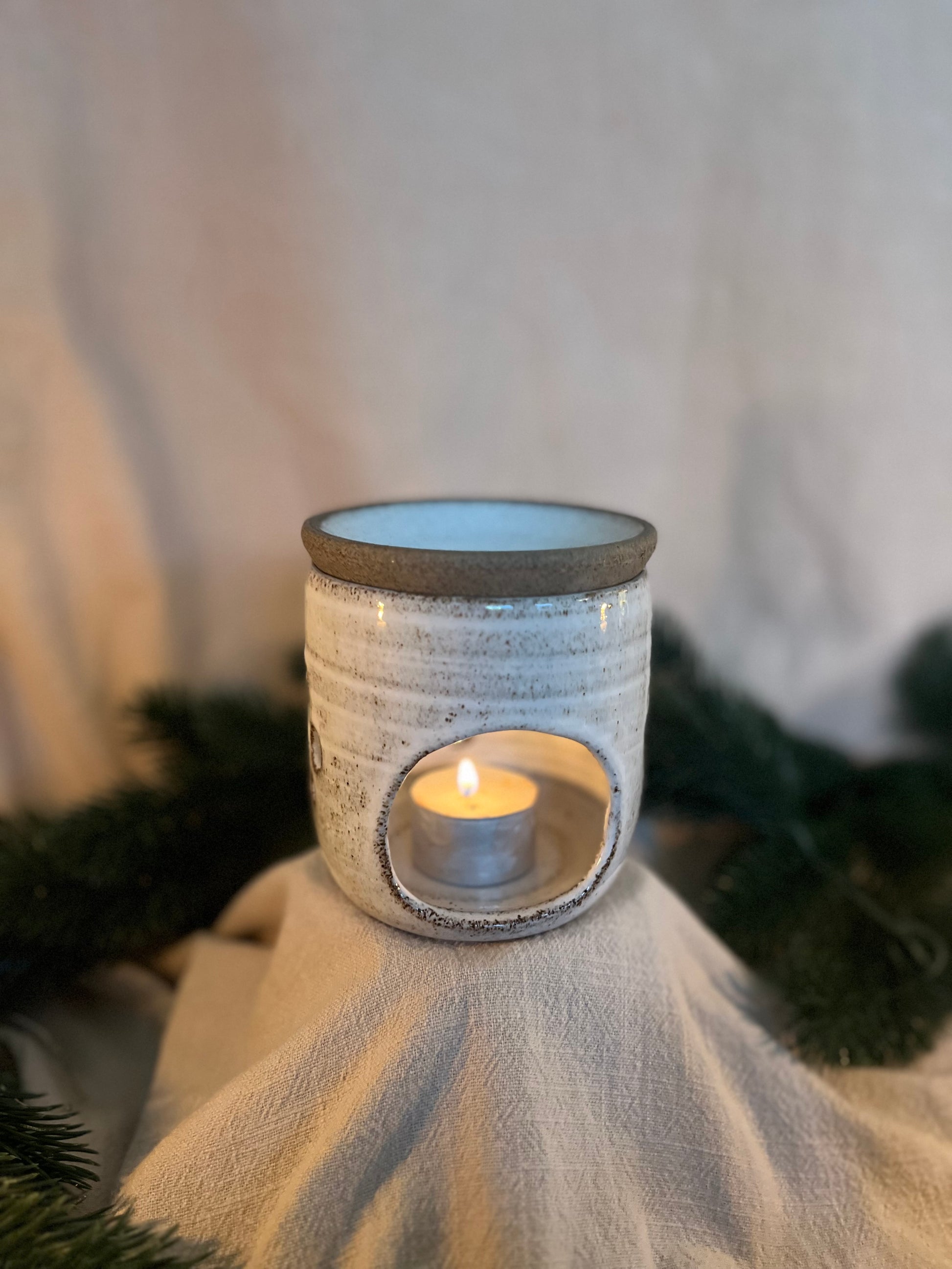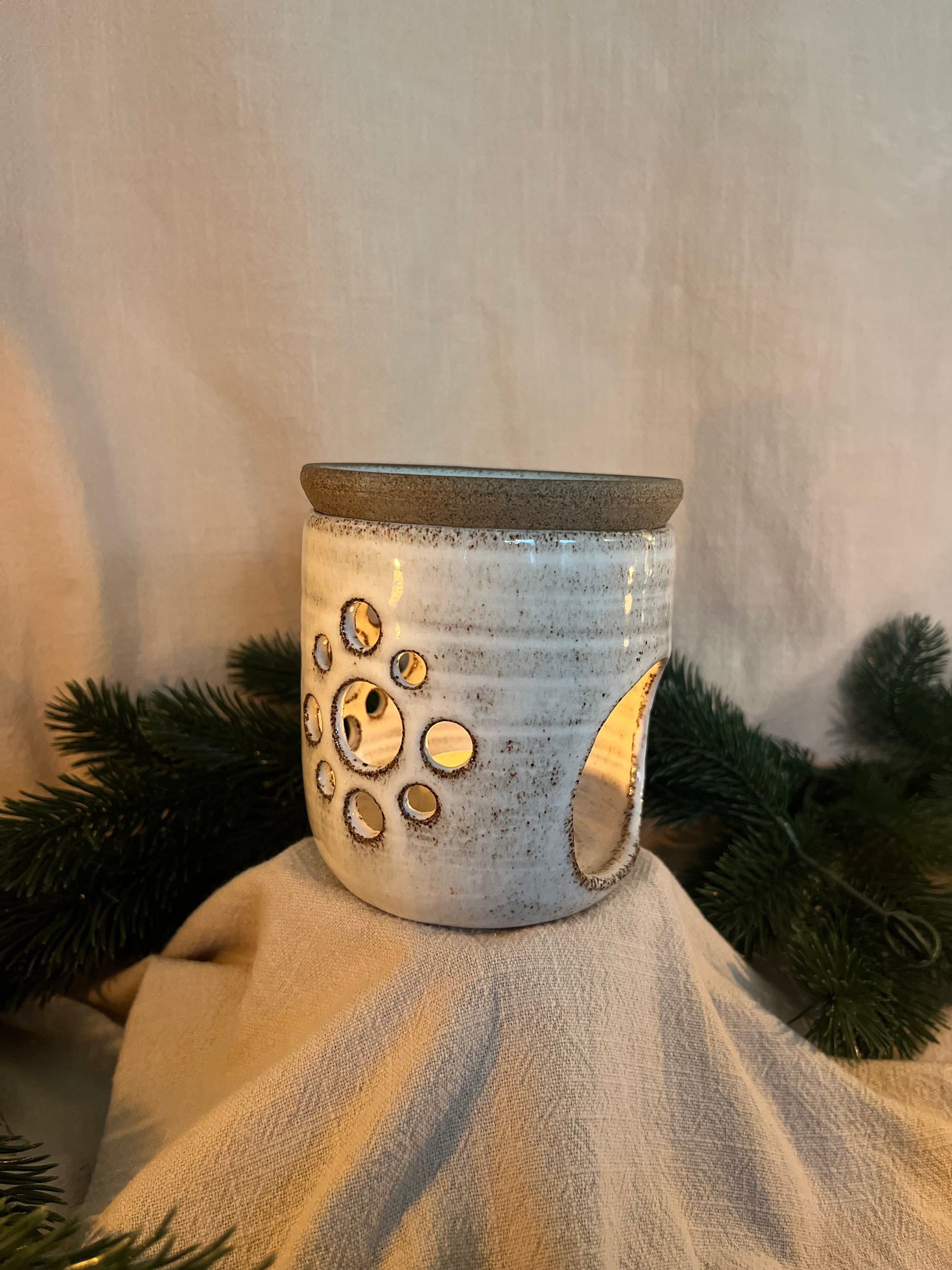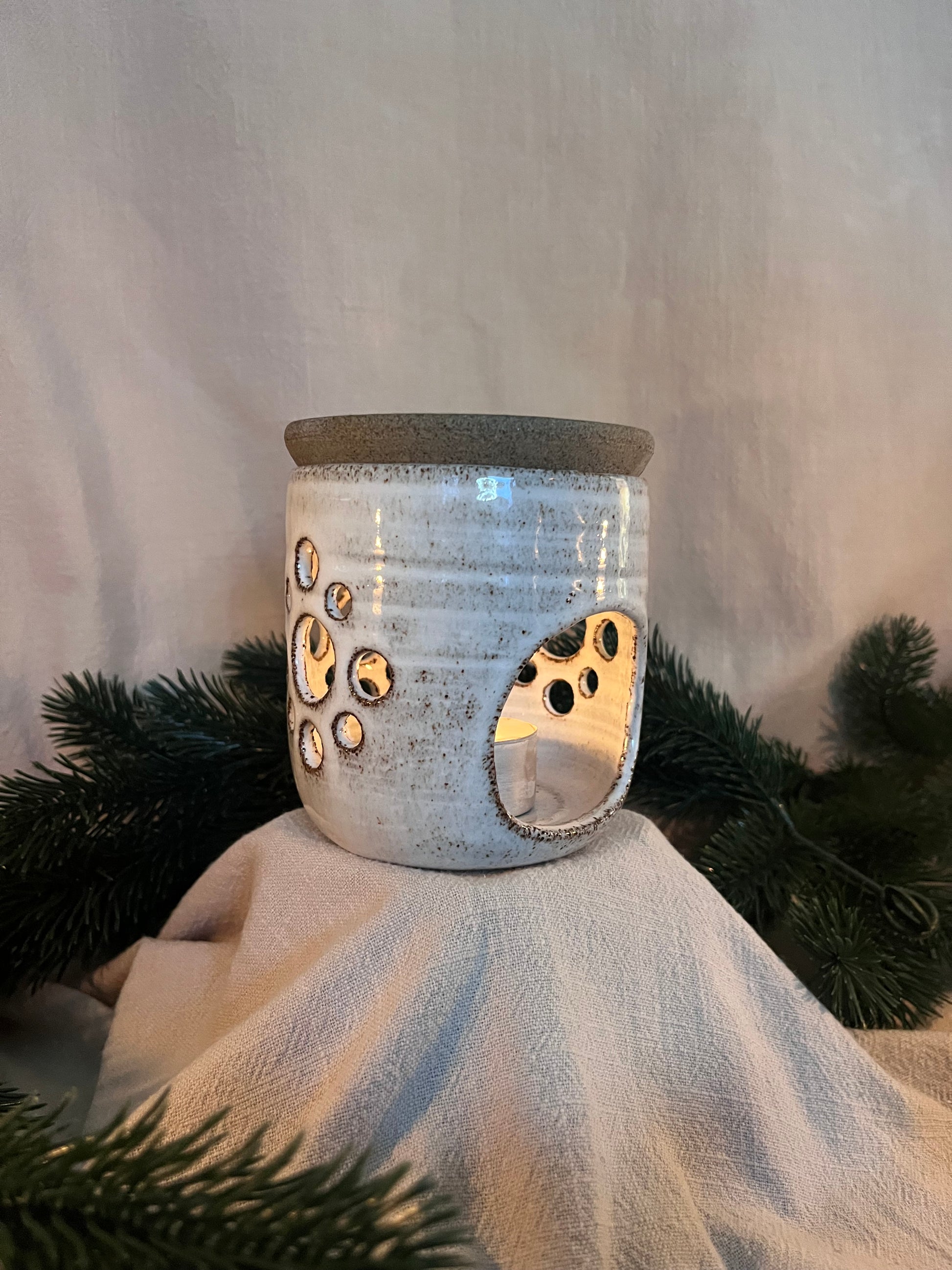 Drejad aromalampa i grov stengodslera. Glaserad i vit blank glasyr.